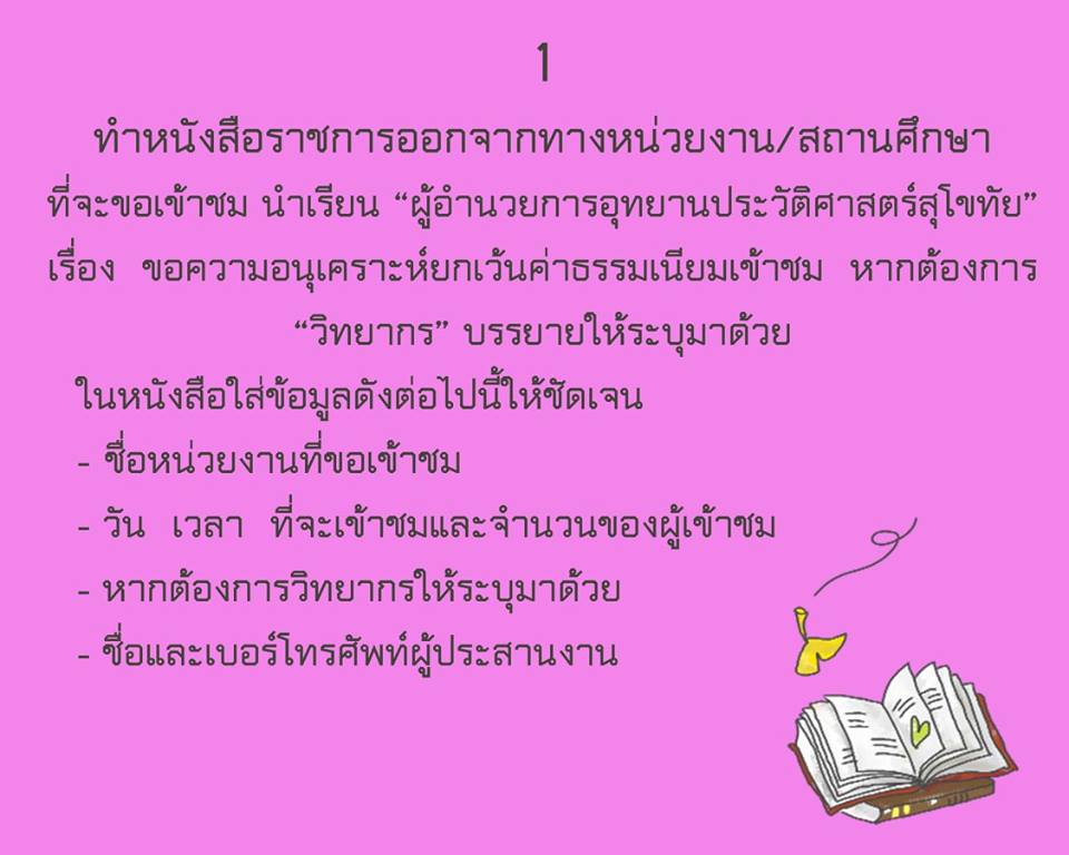 สำหรับขั้นตอนการขออนุญาตเข้าชมอุทยานประวัติศาสตร์สุโขทัย