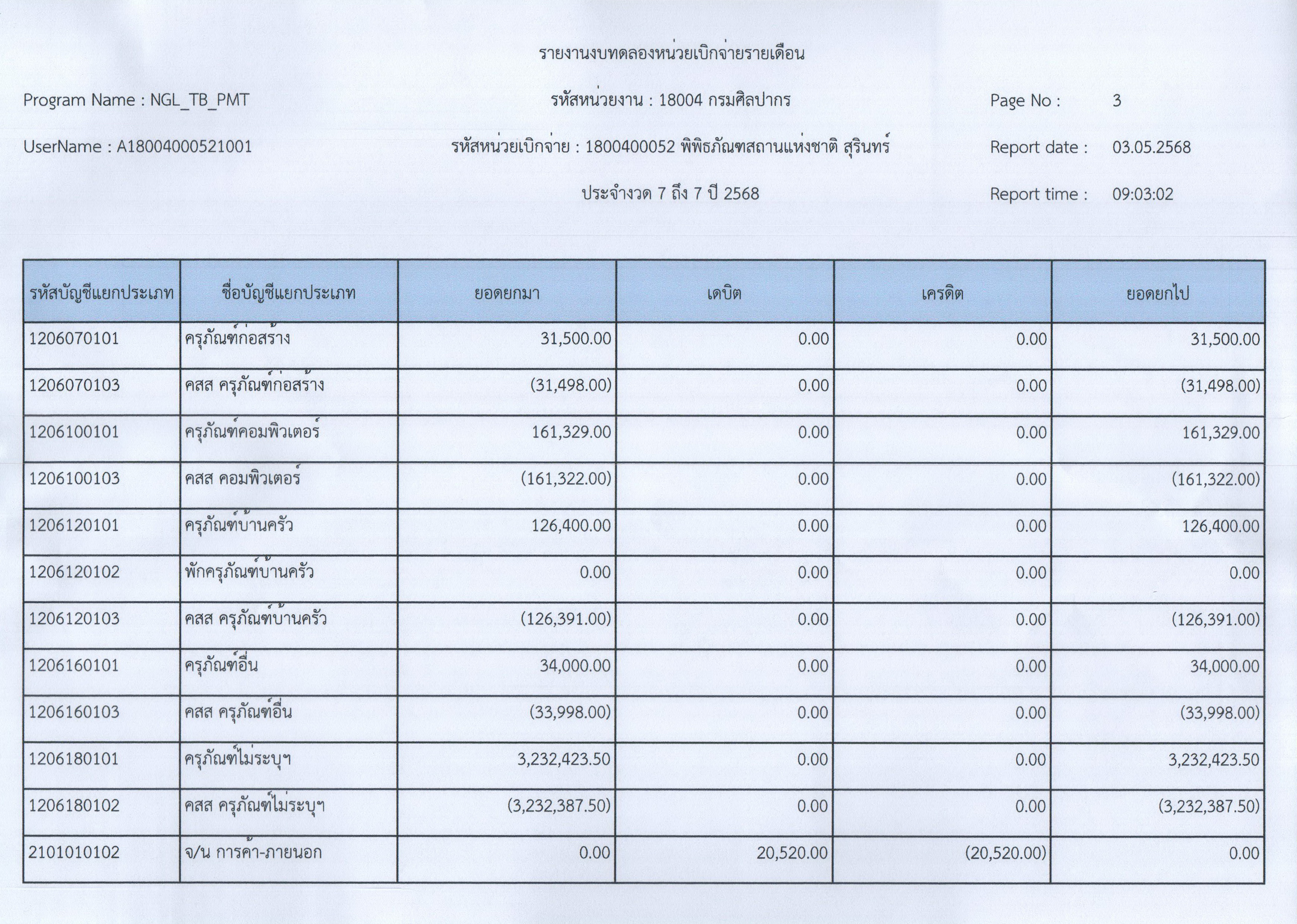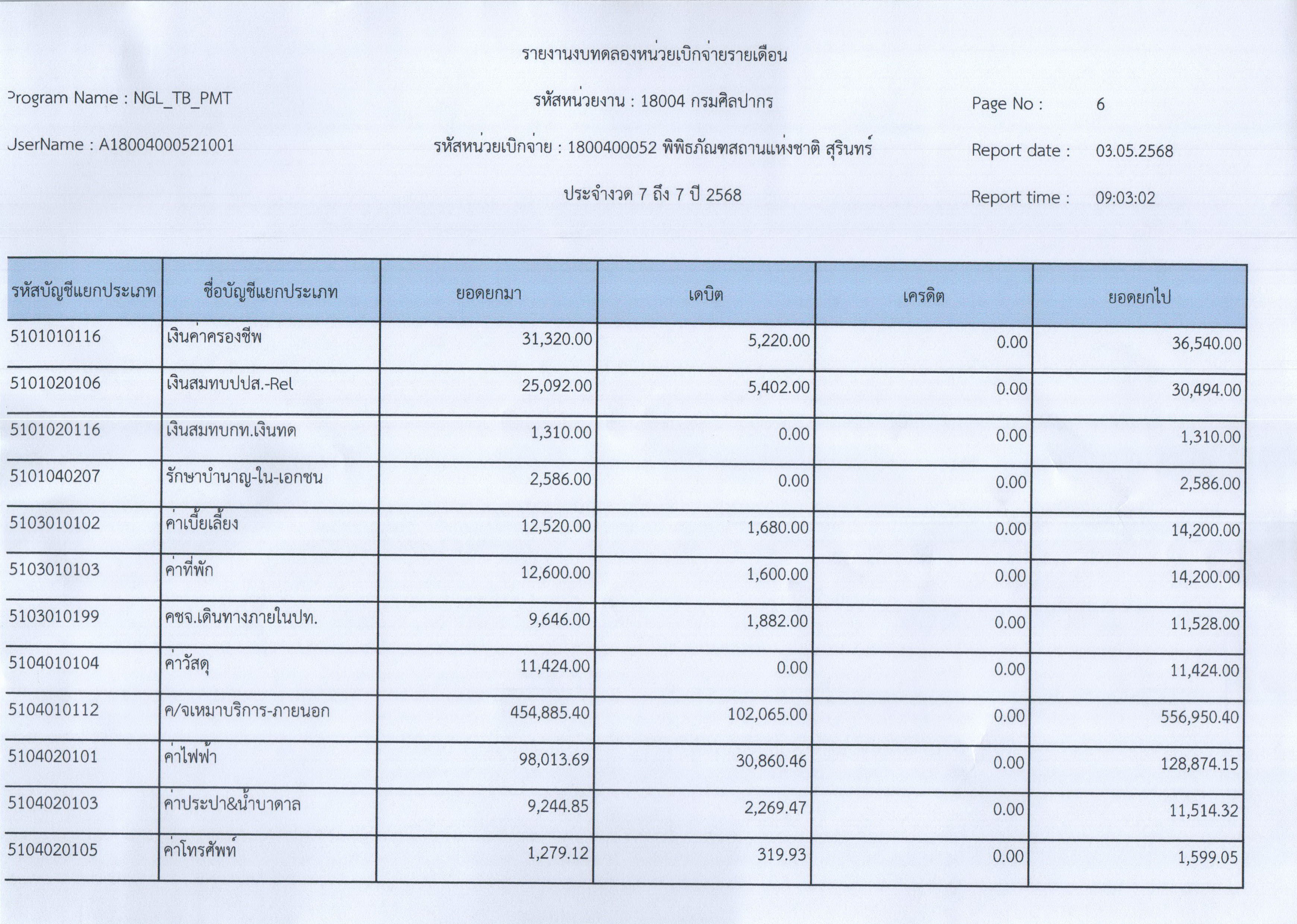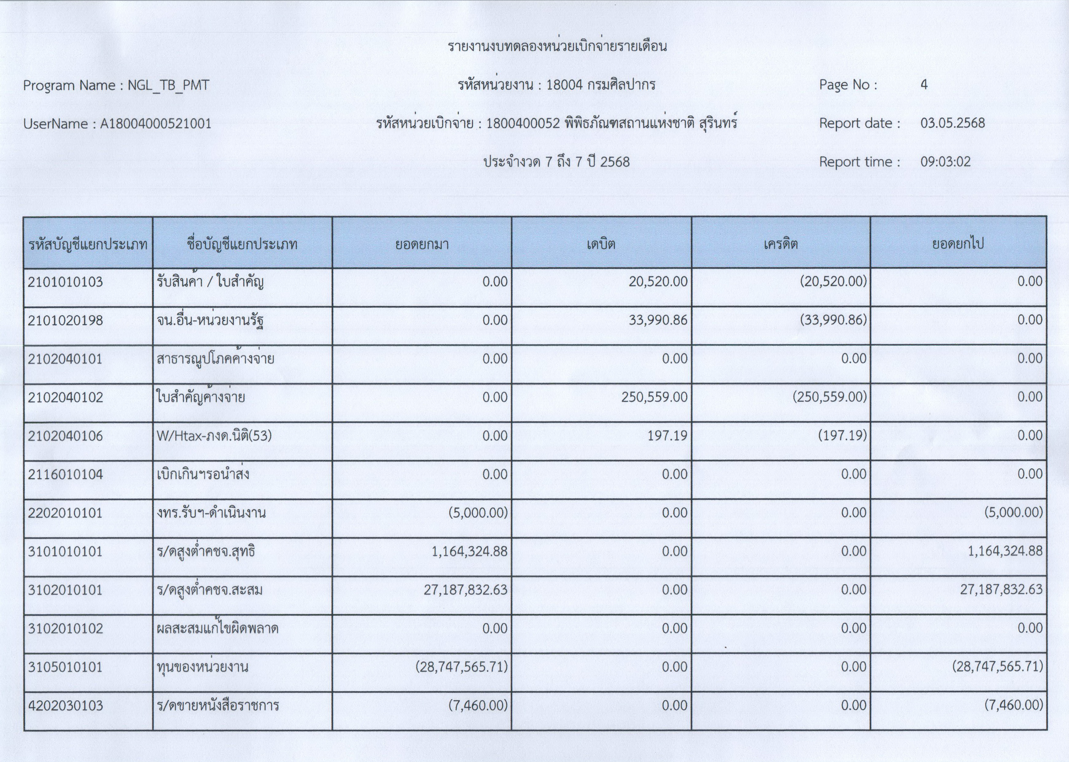 รายงานงบทดลองหน่วยเบิกจ่ายรายเดือน ประจำเดือนเมษายน ๒๕๖๘