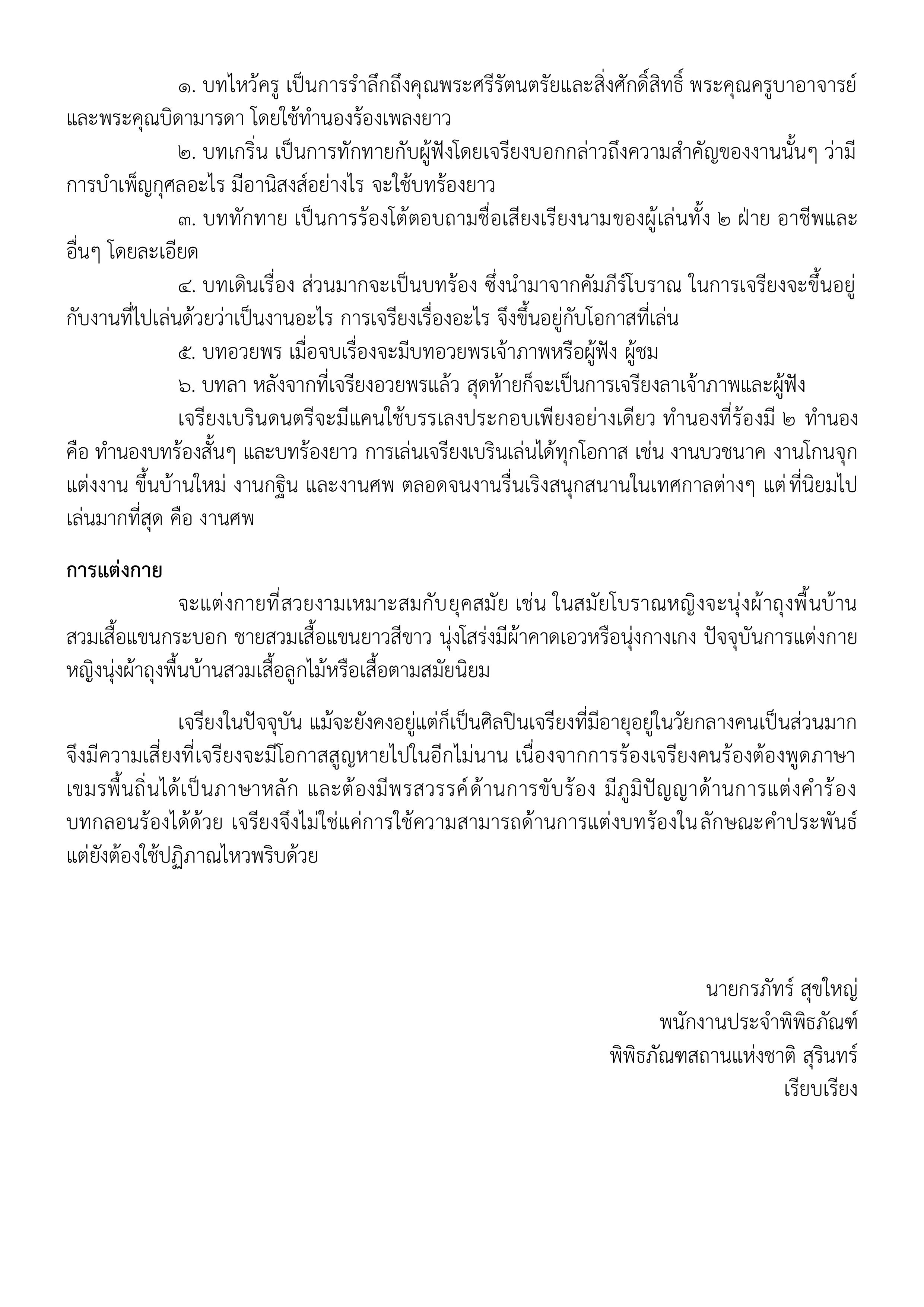 บทความวิชาการพิพิธภัณฑสถานแห่งชาติ สุรินทร์ เรื่อง "เจรียง" โดยนายกรภัทร์ สุขใหญ่ พนักงานประจำพิพิธภัณฑ์ ผู้เรียบเรียง
