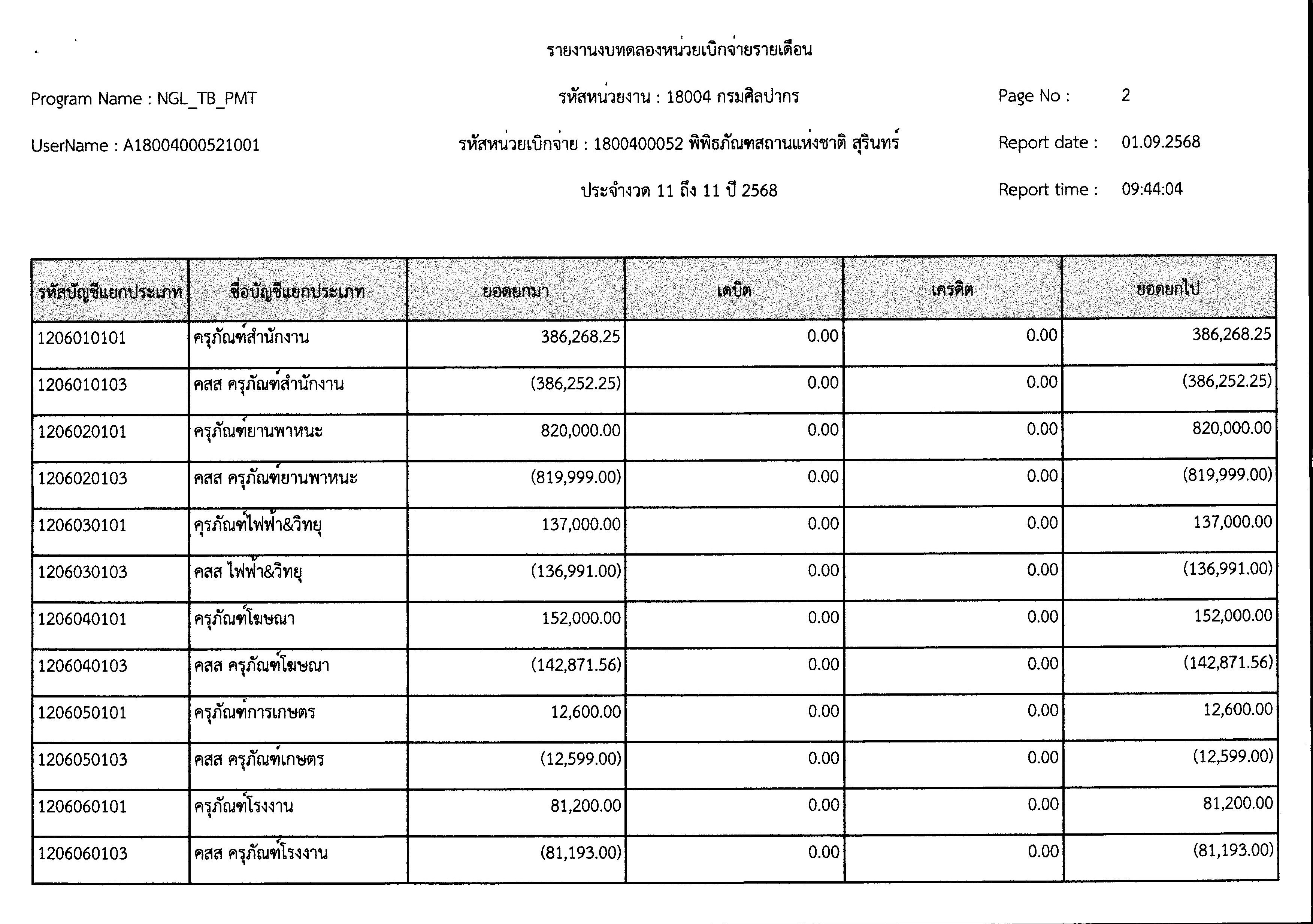 รายงานงบทดลองหน่วยเบิกจ่ายรายเดือน ประจำเดือนสิงหาคม ๒๕๖๘
