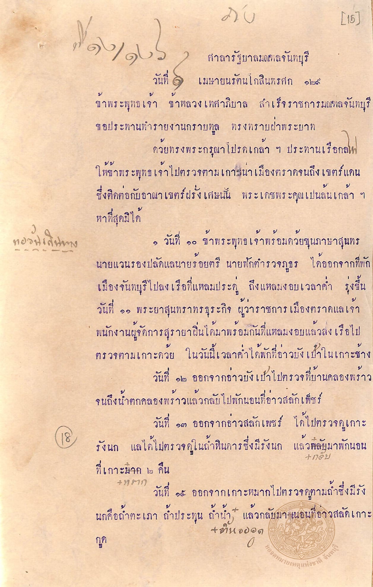 (ร.ศ.128-ร.ศ.133) ในช่วงต้นการรับราชการที่มณฑลจันทบุรี ร.ศ.128 ได้รับพระดำริห์จาก สมเด็จพระเจ้าบรมวงศ์เธอ กรมพระยาดำรงราชานุภาพ เสนาบดีกระทรวงมหาดไทย ให้เดินทางตรวจราชการตามเกาะ ชายทะเล และชายแดนพระราชอาณาจักร เพื่อรายงานกลับไปยังกระทรวงมหาดไทยให้ทรงทราบ ในการตรวจราชการคราวนี้ได้ใช้เรื่อกลจากกรมทหารเรือที่ 47 เป็นพาหนะในการเดินทาง ตรวจราชการคราวนี้ใช้เวลา 18 วัน ตรวจราชการเมืองตราดและอำเภอขลุง เอกสารจดหมายเหตุชุดนี้เห็นหลักฐานชั้นต้นที่สะท้อนเรื่องราวที่น่าสนใจในอดีตได้อย่างมาก ทั้งสภาพพื้นที่ วิถีชีวิตชาวพื้นเมือง สภาพบ้านเรือน อาชีพราชฏร และทรัพยากรในพื้นที่ เช่น มะพร้าว หวายพัศเดา รังนก พลอยแดง เป็นต้น เอกสารชุดนี้ผู้เขียนนำมาเสนอเพียงบางส่วนเท่านั้น ผู้ค้นคว้าที่สนใจสามารถเข้ามาใช้บริการเอกสารได้ที่หอจดหมายเหตุแห่งชาติ จันทบุรี
