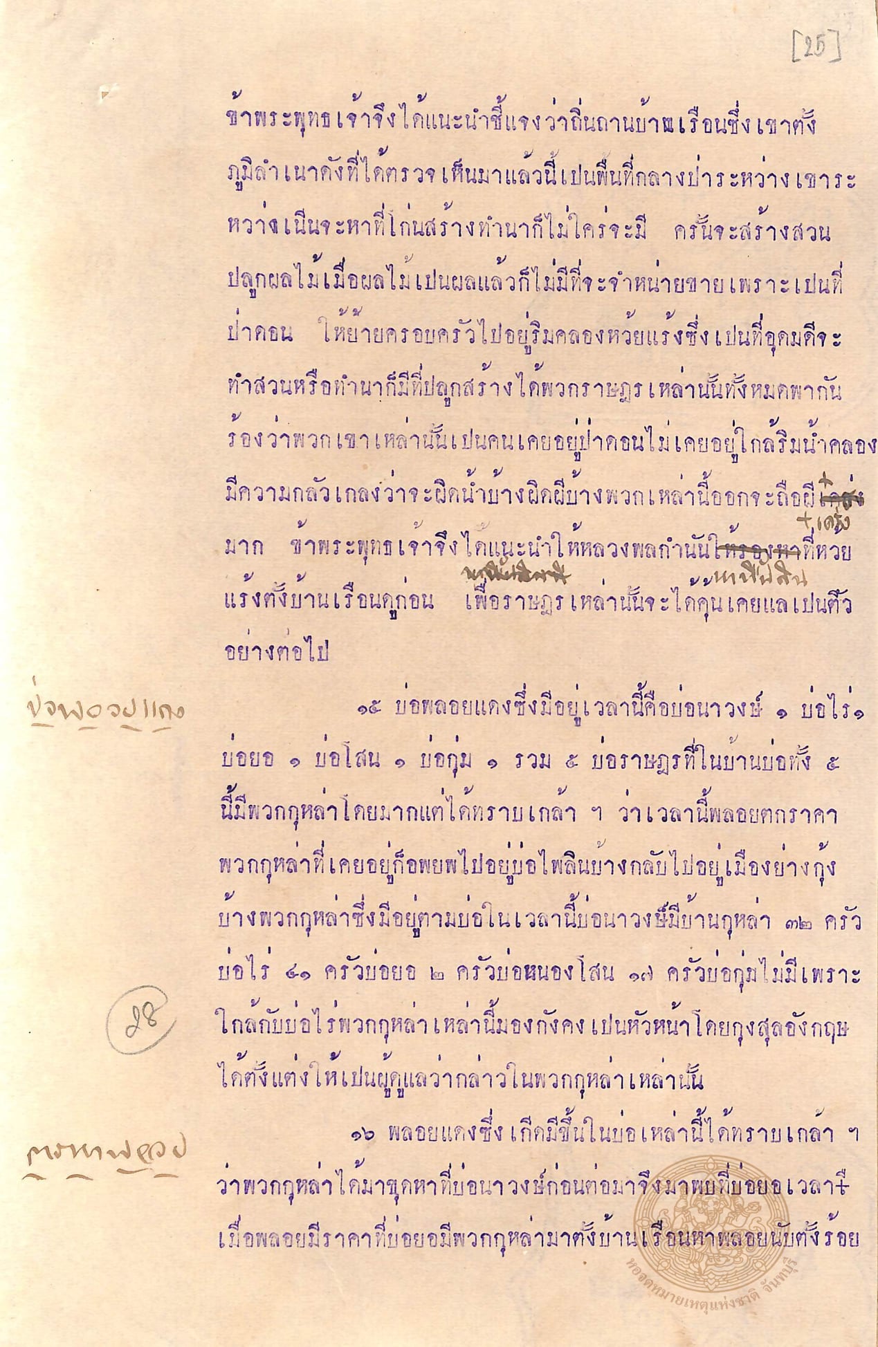 23 ตรวจถึงหลักเขตปลายสันเขาบรรทัดและตรวจหมู่บ้านบ่อยอบ่อหนองโสน ซึ่งพวกกุลาตั้งทำพลอย