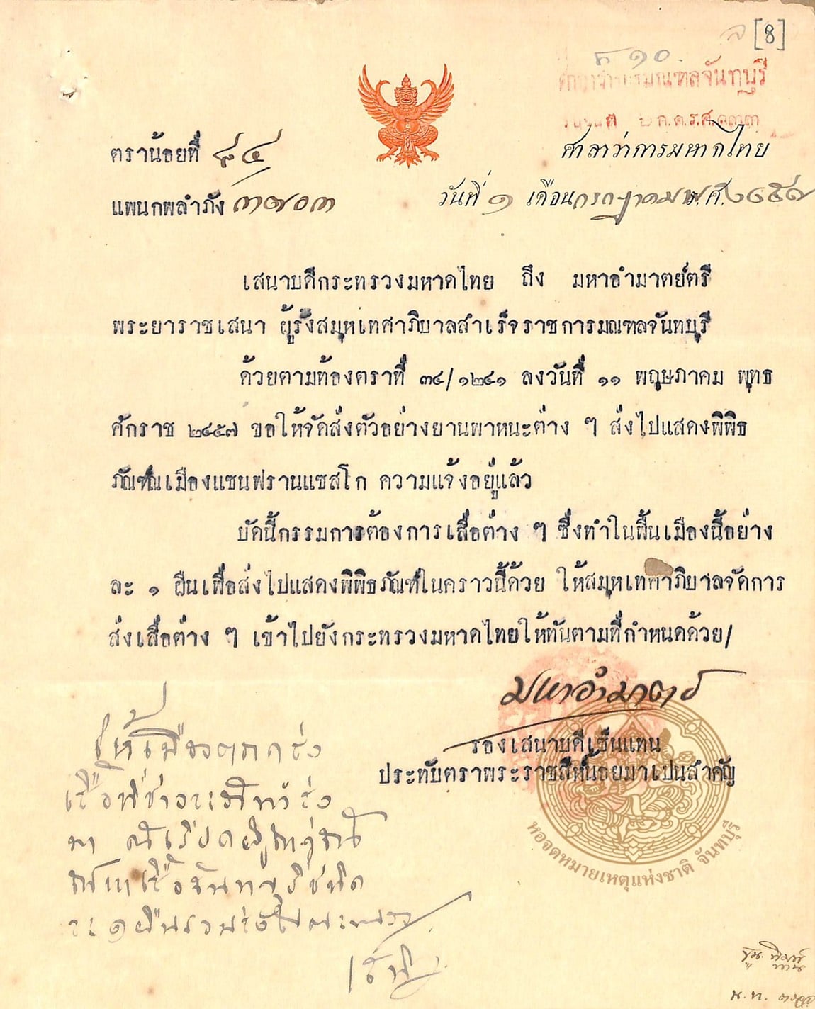 หอจดหมายเหตุแห่งชาติ จันทบุรี.(๑๓)มท ๒.๒.๔/๑๖ เอกสารกระทรวงมหาดไทยชุดมณฑลจันทบุรี.เรื่องกระทรวงมหาดไทยสั่งให้จัดทำยานพาหนะต่าง ๆ ส่งเข้าไปกรุงเทพฯ(๑๑ พ.ค.๒๔๕๗-๒ มิ.ย.๒๔๖๒)