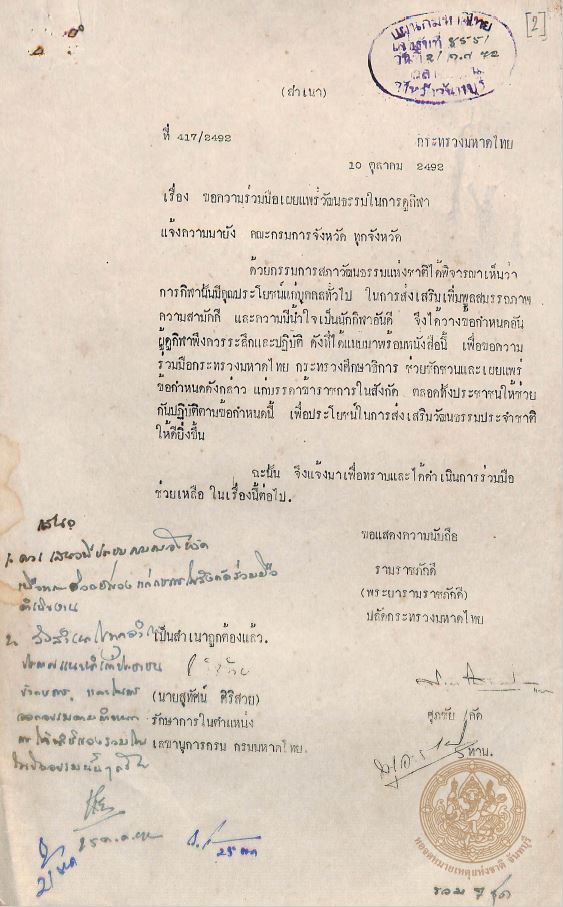 ปี ๒๔๙๒ สภาวัฒนธรรมแห่งชาติเผยแพร่วัฒนธรรมในการดูกีฬา