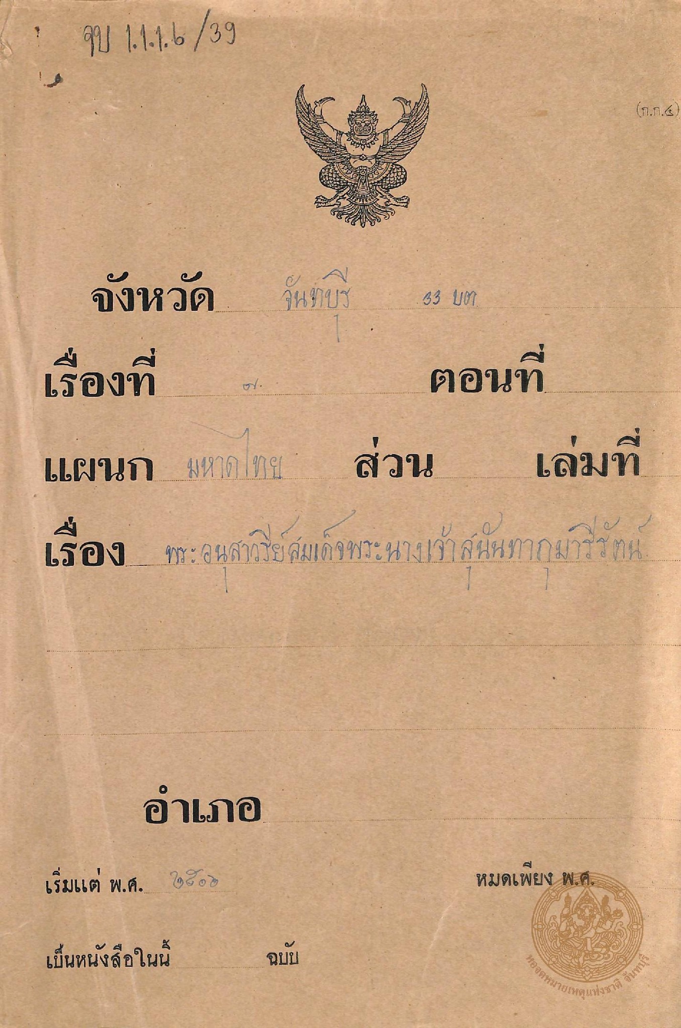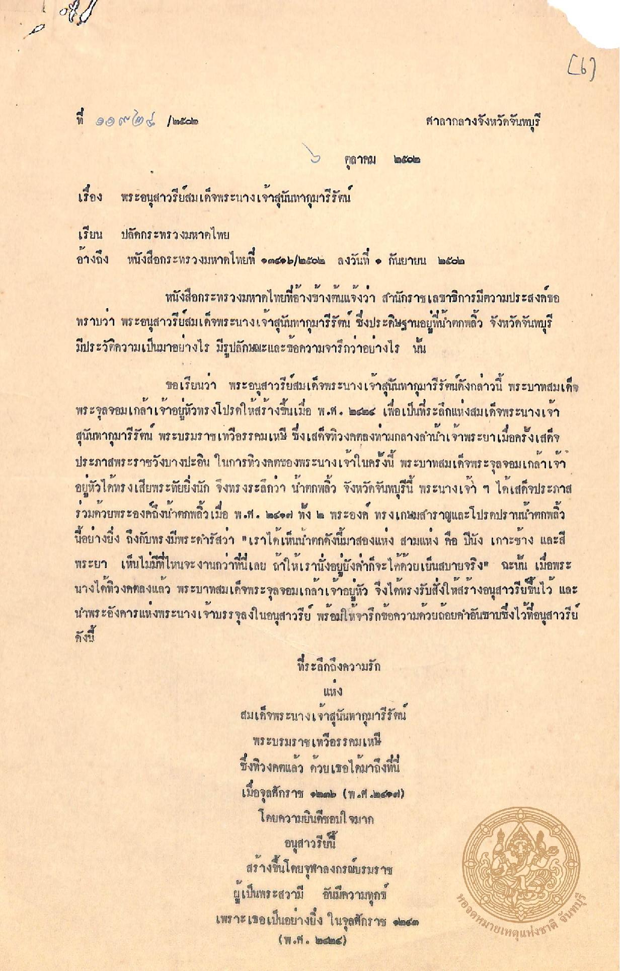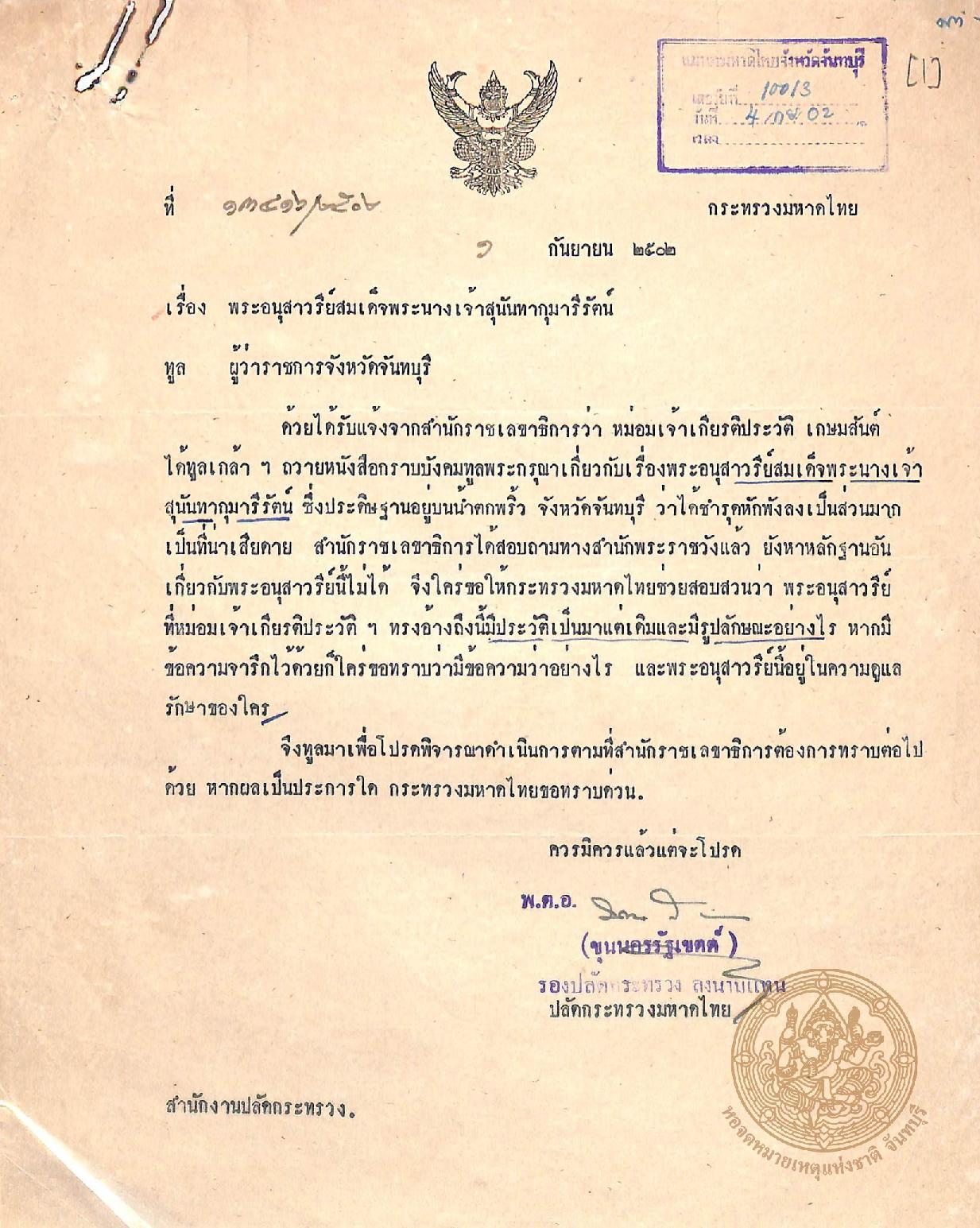 หอจดหมายเหตุแห่งชาติจันทบุรี. จบ 1.1.1.6/39 เอกสารกระทรวงมหาดไทย ชุดจังหวัดจันทบุรี เรื่องพระอนุสาวรีย์สมเด็จพระนางเจ้าสุนันทากุมารีรัตน์ (4 สิงหาคม – 6 ตุลาคม 2502)