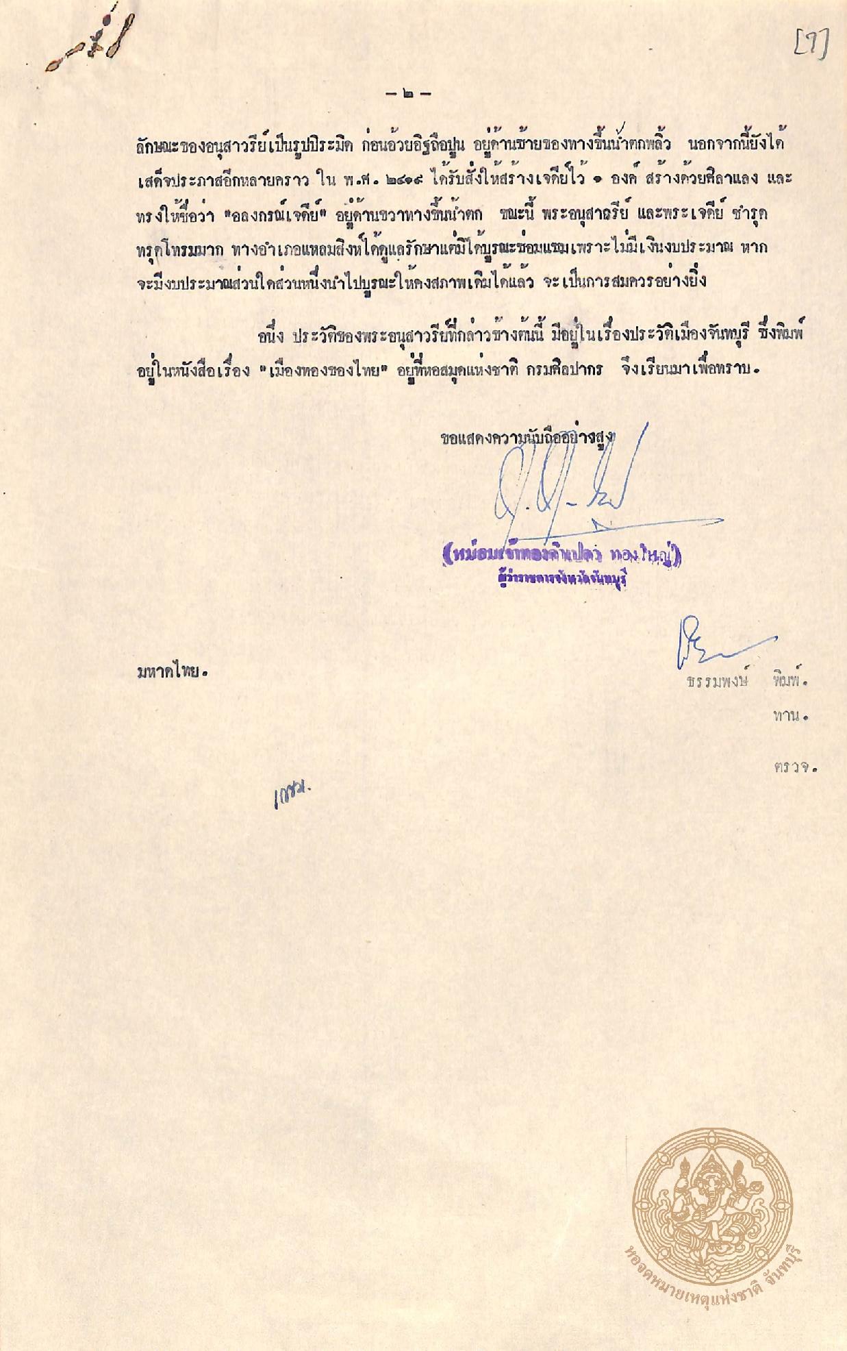 รายงานประวัติของพระอนุสาวรีย์ โดยหม่อมเจ้าทองคำเปลว ทองใหญ่ ผู้ว่าราชการจังหวัดจันทบุรี ถึงปลัดกระทรวงมหาดไทย มีการบรรยายถึงประวัติความเป็นมา รูปลักษณะ และข้อความในจารึก ความดังเอกสาร