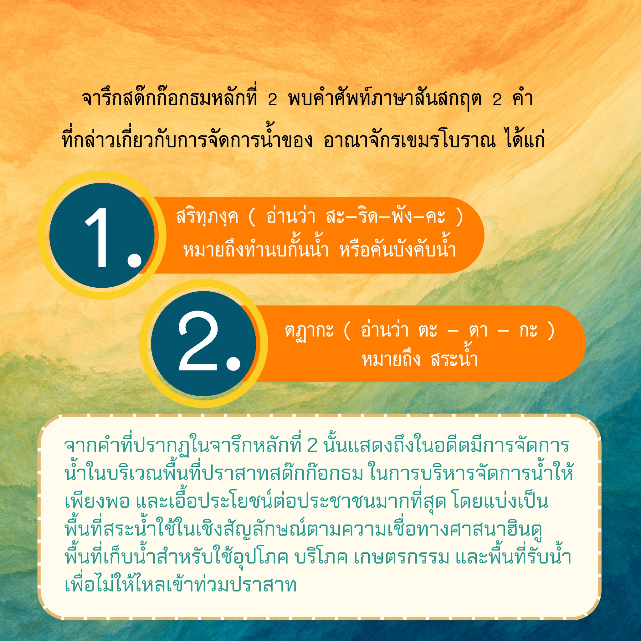 จารึกสด๊กก๊อกธมหลักที่ 2 พบคำศัพท์ภาษาสันสกฤต 2 คำ ที่กล่าวเกี่ยวกับการจัดการน้ำของอาณาจักรเขมรโบราณได้แก่
