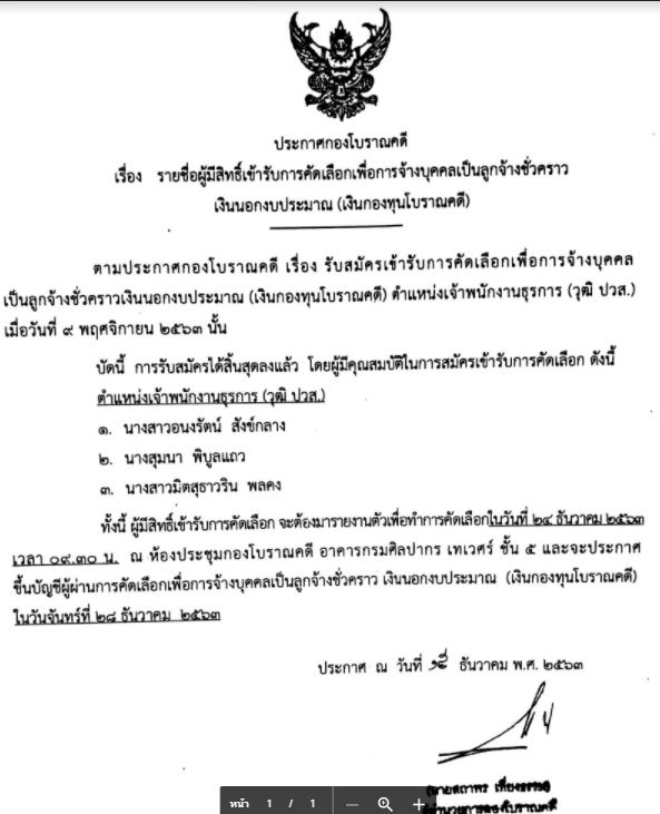 รายชื่อผู้มีสิทธิ์เข้ารับการคัดเลือกเพื่อการจ้างบุคคลเป็นลูกจ้างชั่วคราวเงินนอกงบประมาณ (เงินกองทุนโบราณคดี)