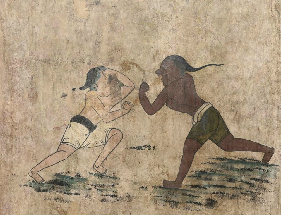 ภาพจิตรกรรมฝาผนัง แสดงการต่อสู้และป้องกันตัว ศาสตร์และศิลปะการต่อสู้ที่ใช้ร่างกายเป็นอาวุธ