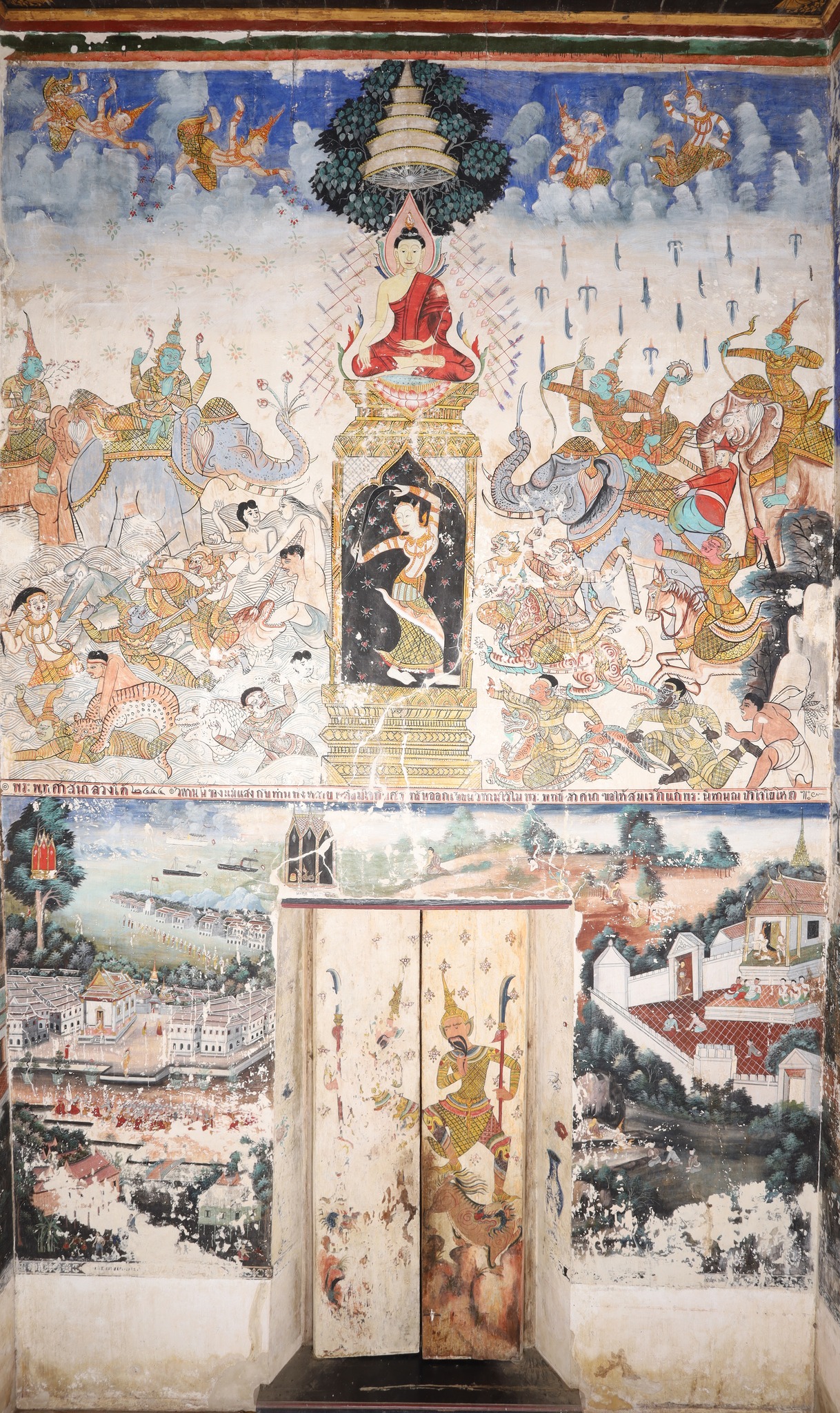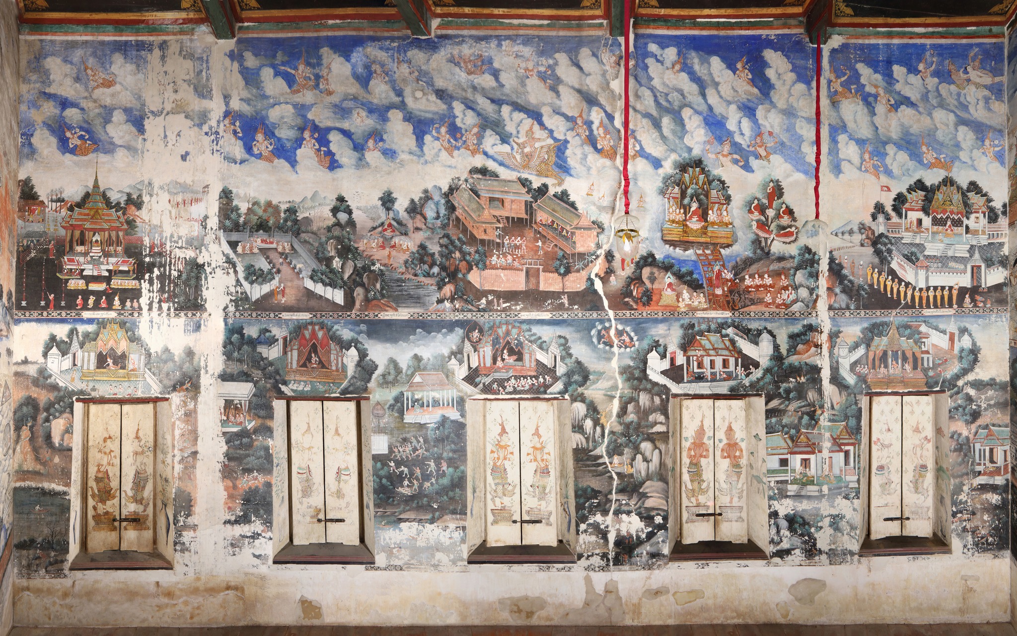 ช่วงบนเขียนภาพเล่าเรื่องพุทธประวัติ ช่วงล่างระหว่างช่องหน้าต่างเขียนภาพเล่าเรื่องทศชาติชาดก