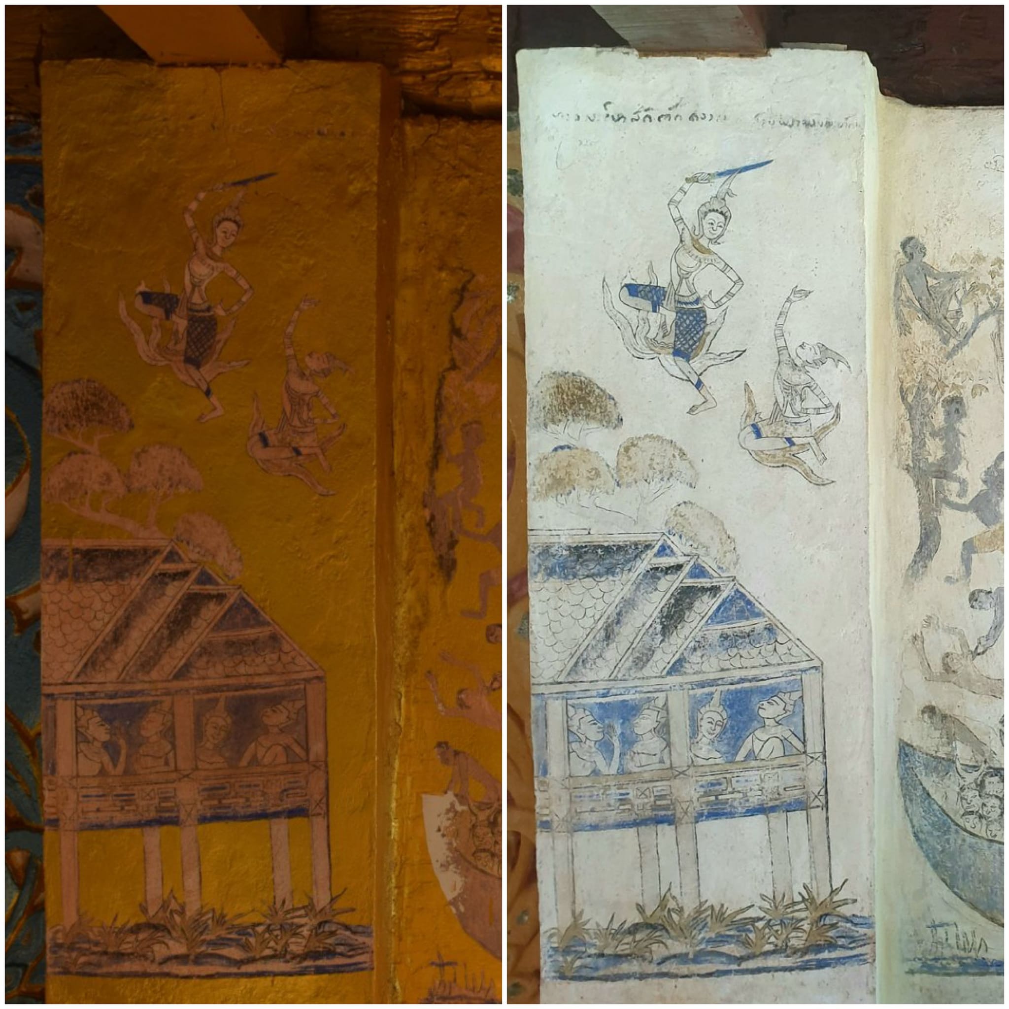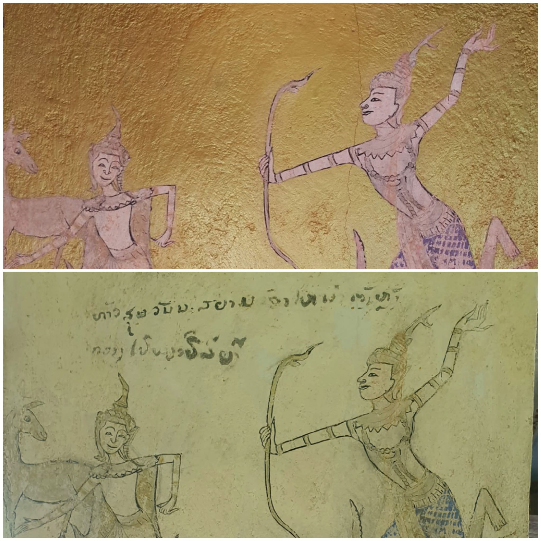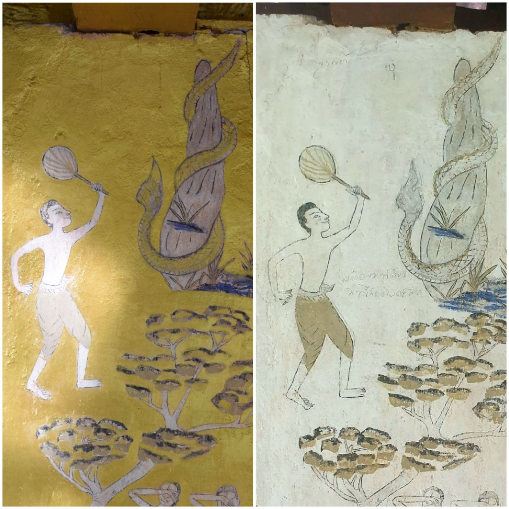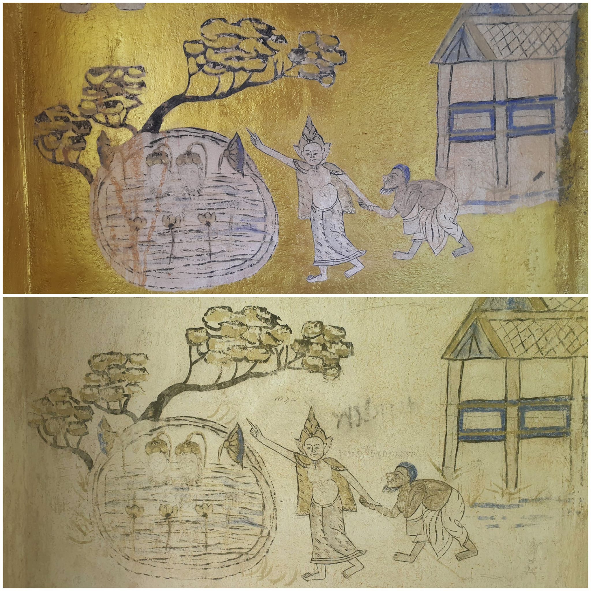 ภาพแสดงเปรียบเทียบก่อนและหลังการอนุรักษ์จิตรกรรมฝาผนัง