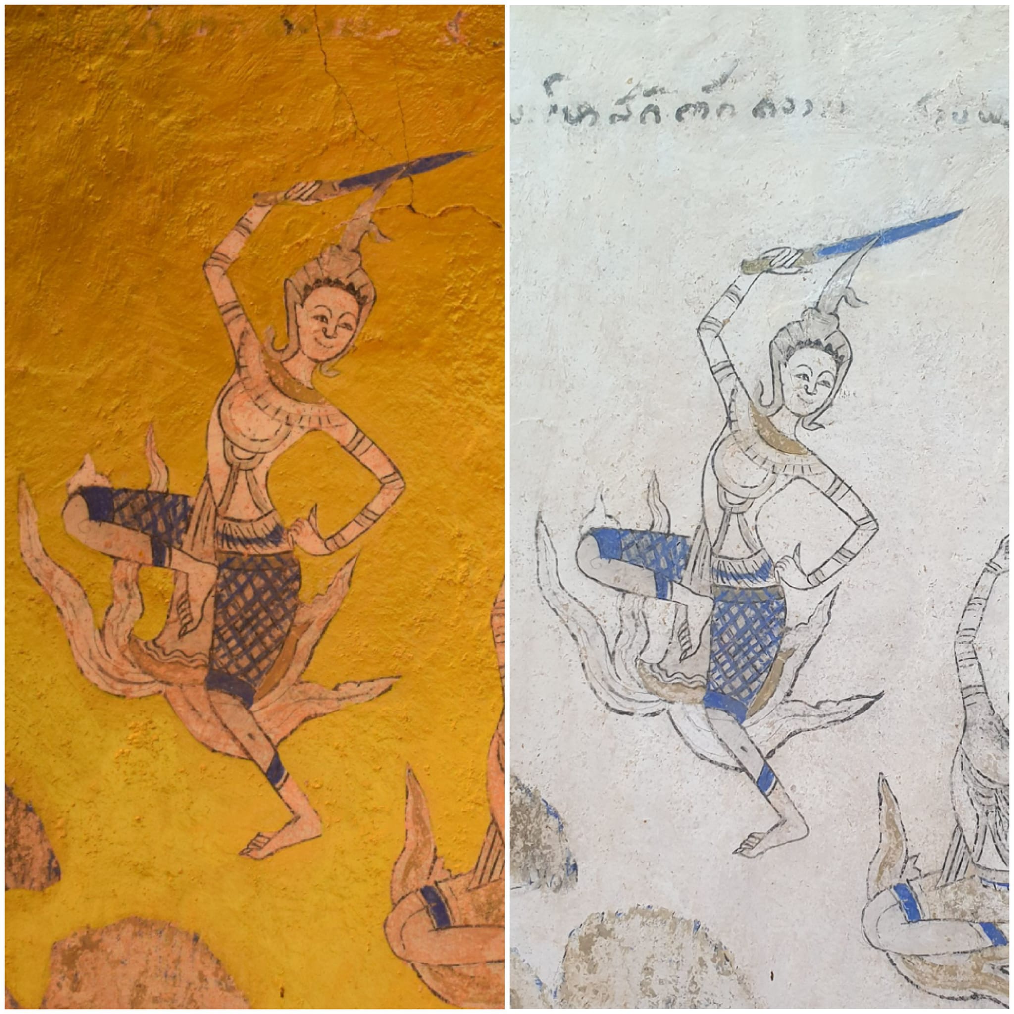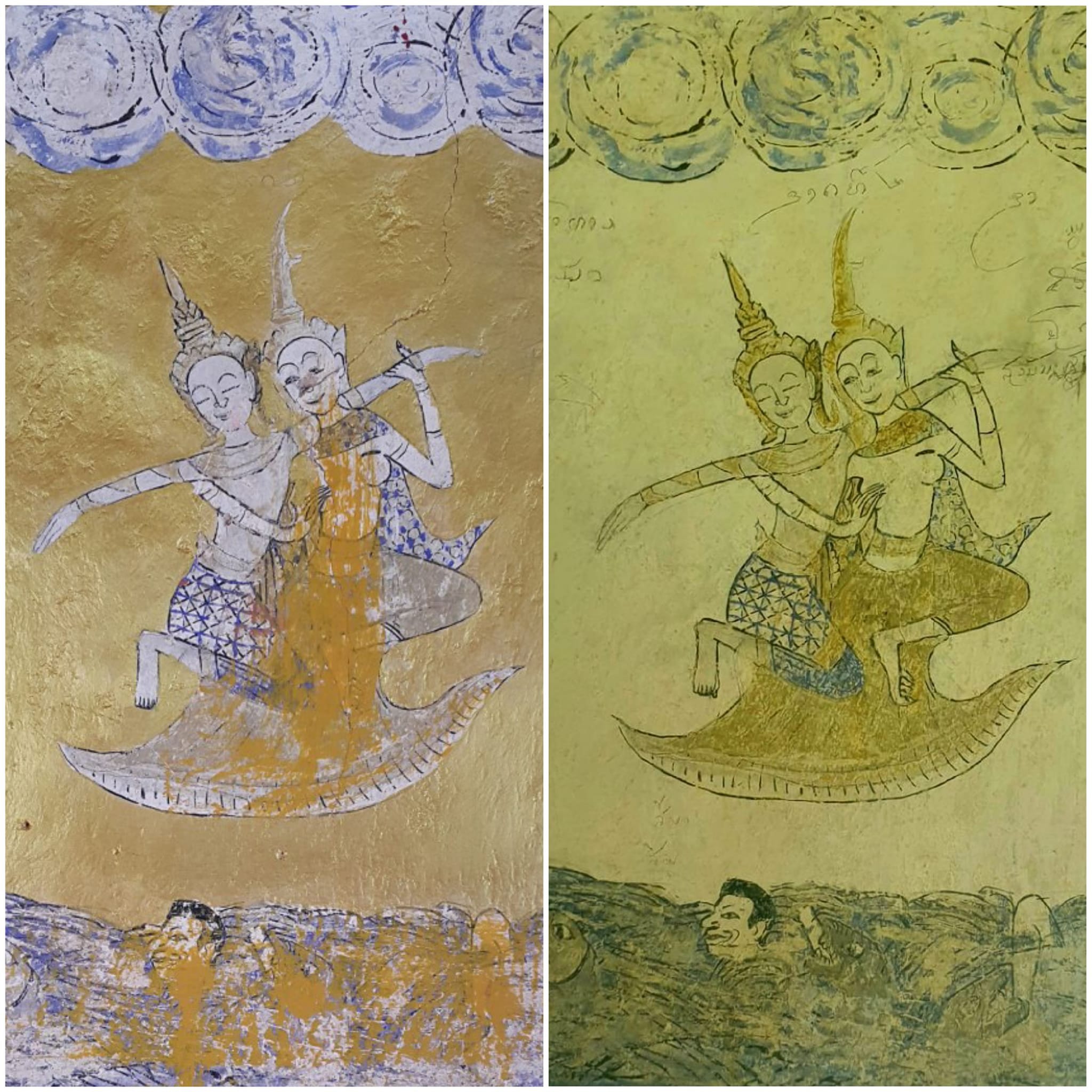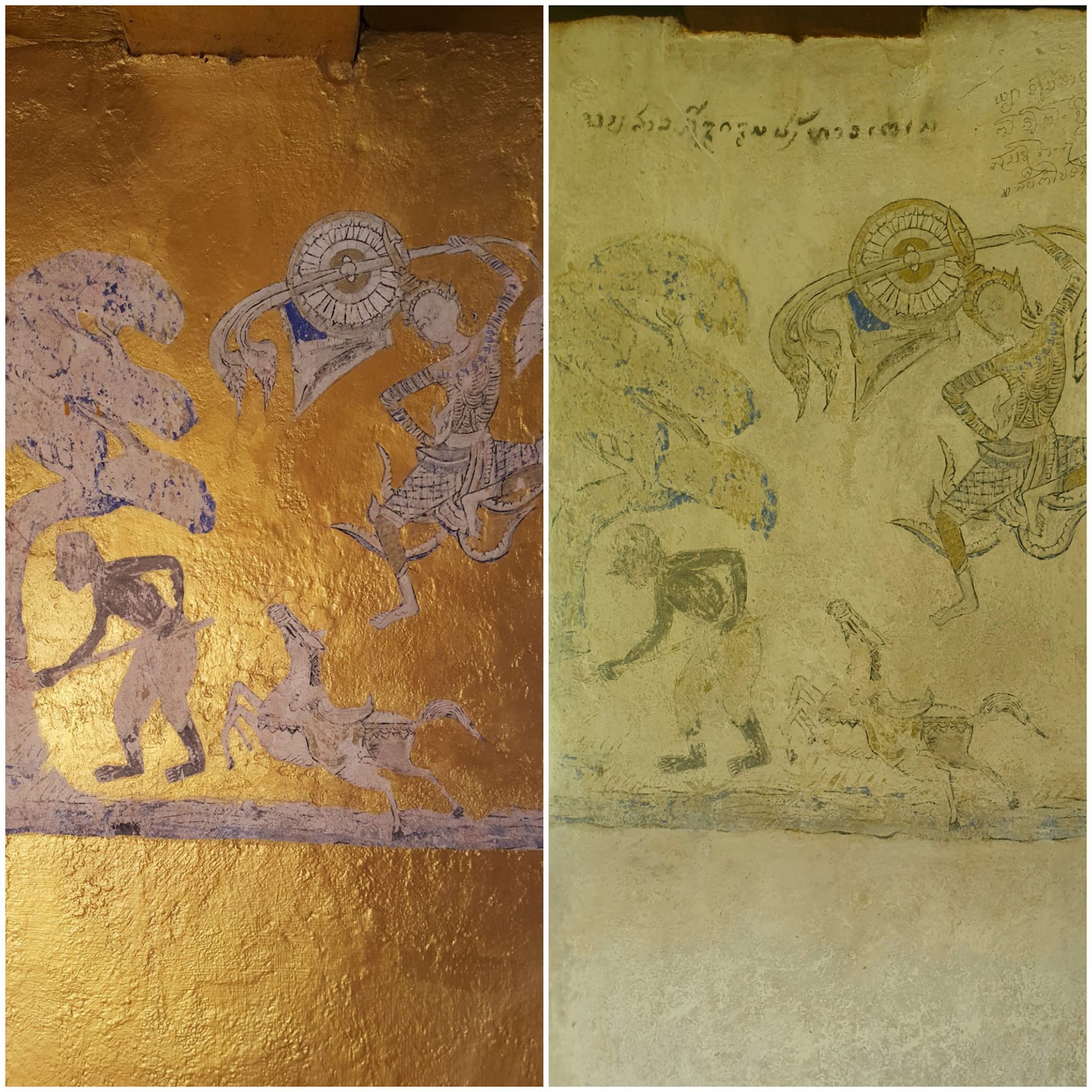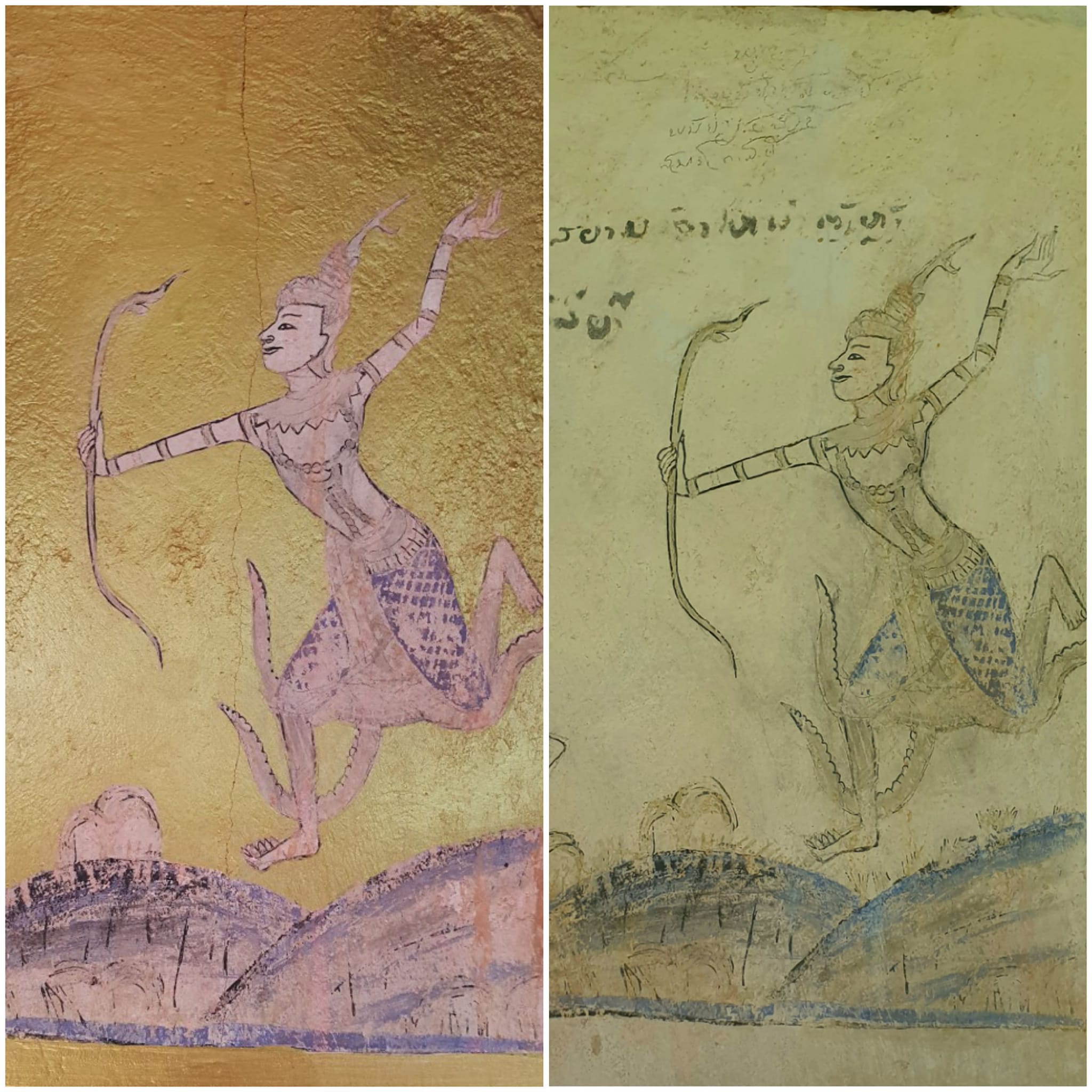 ภาพแสดงเปรียบเทียบก่อนและหลังการอนุรักษ์จิตรกรรมฝาผนัง
