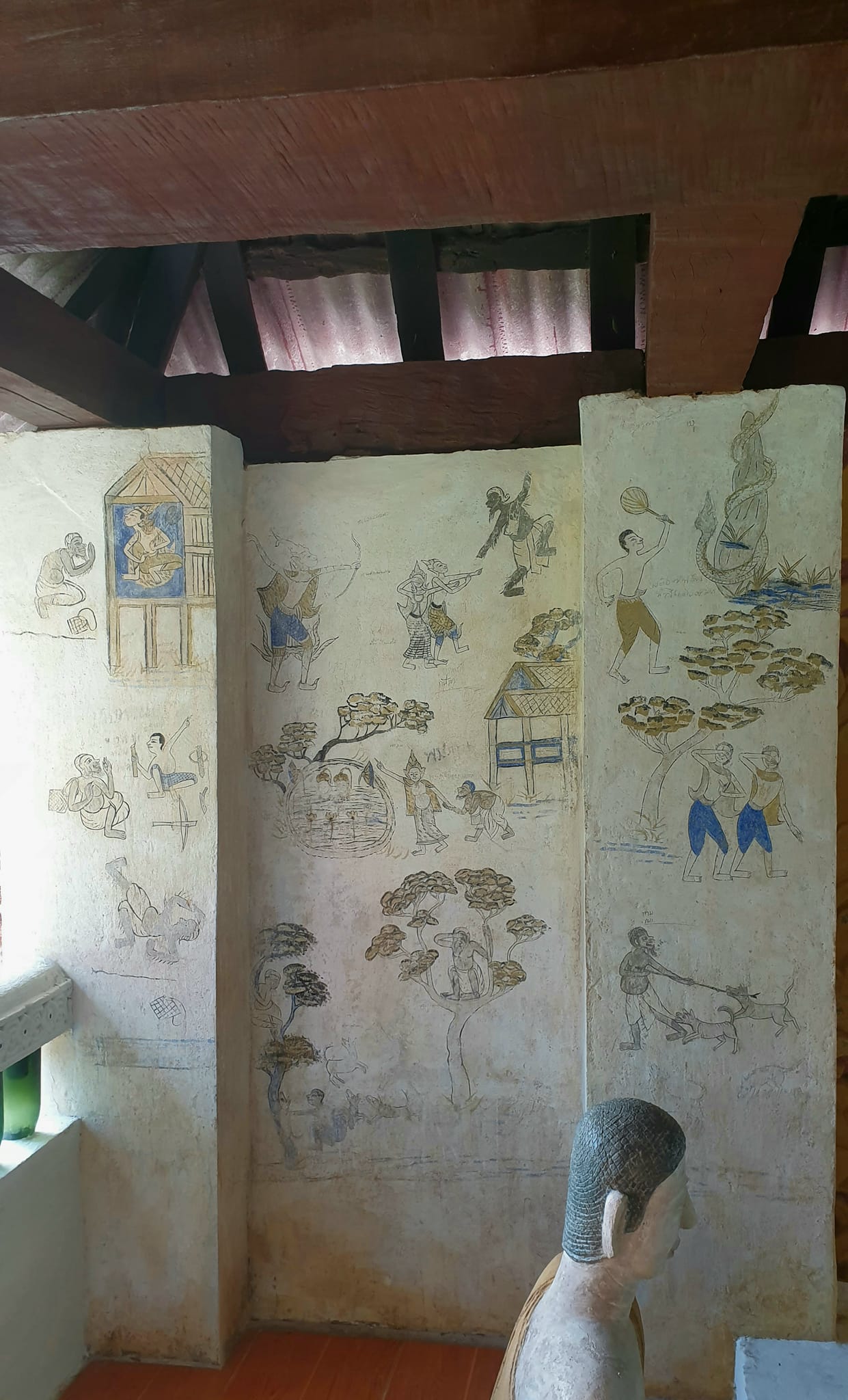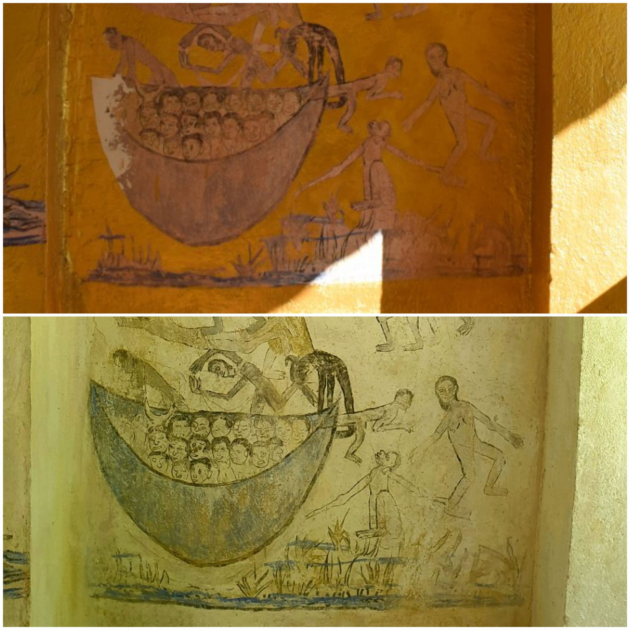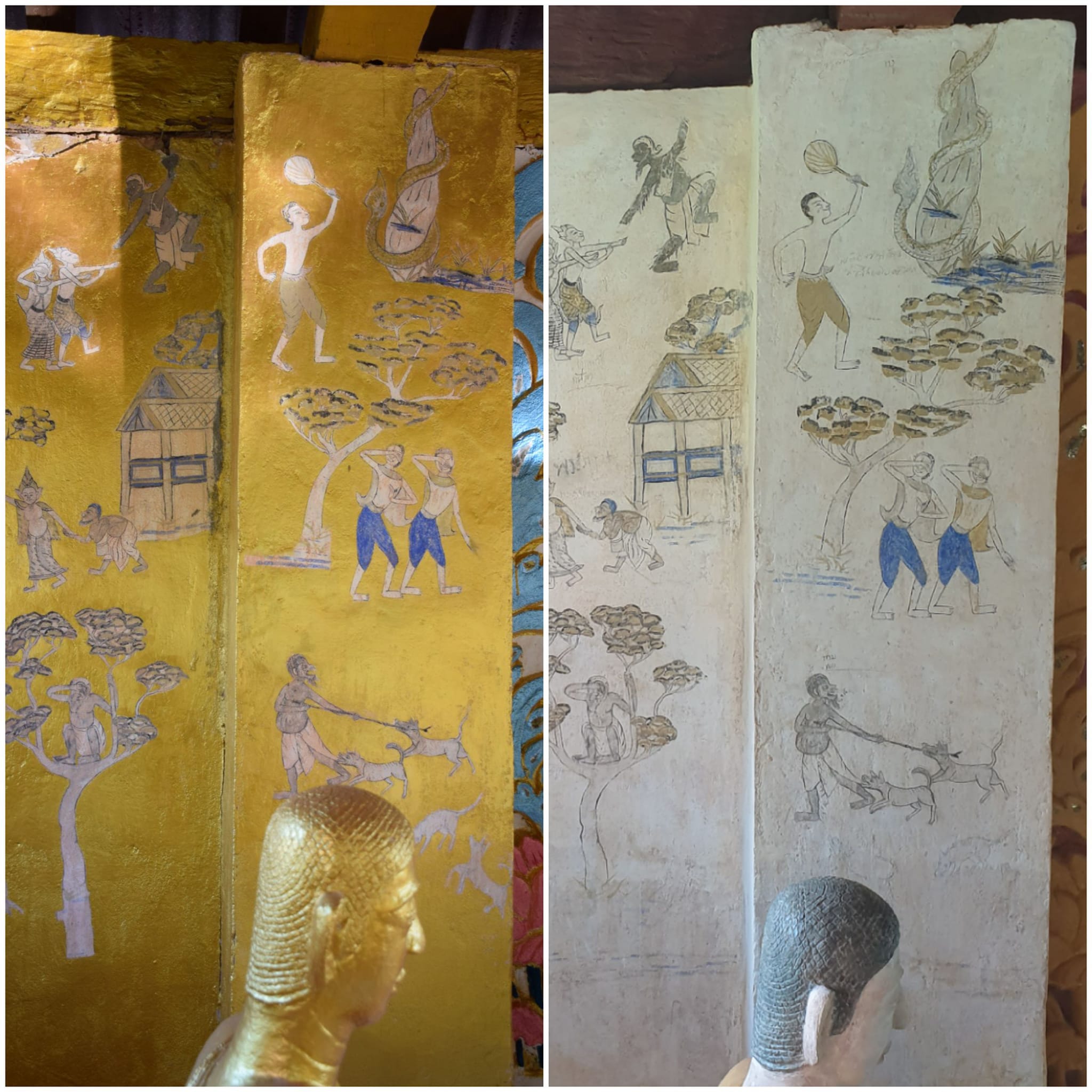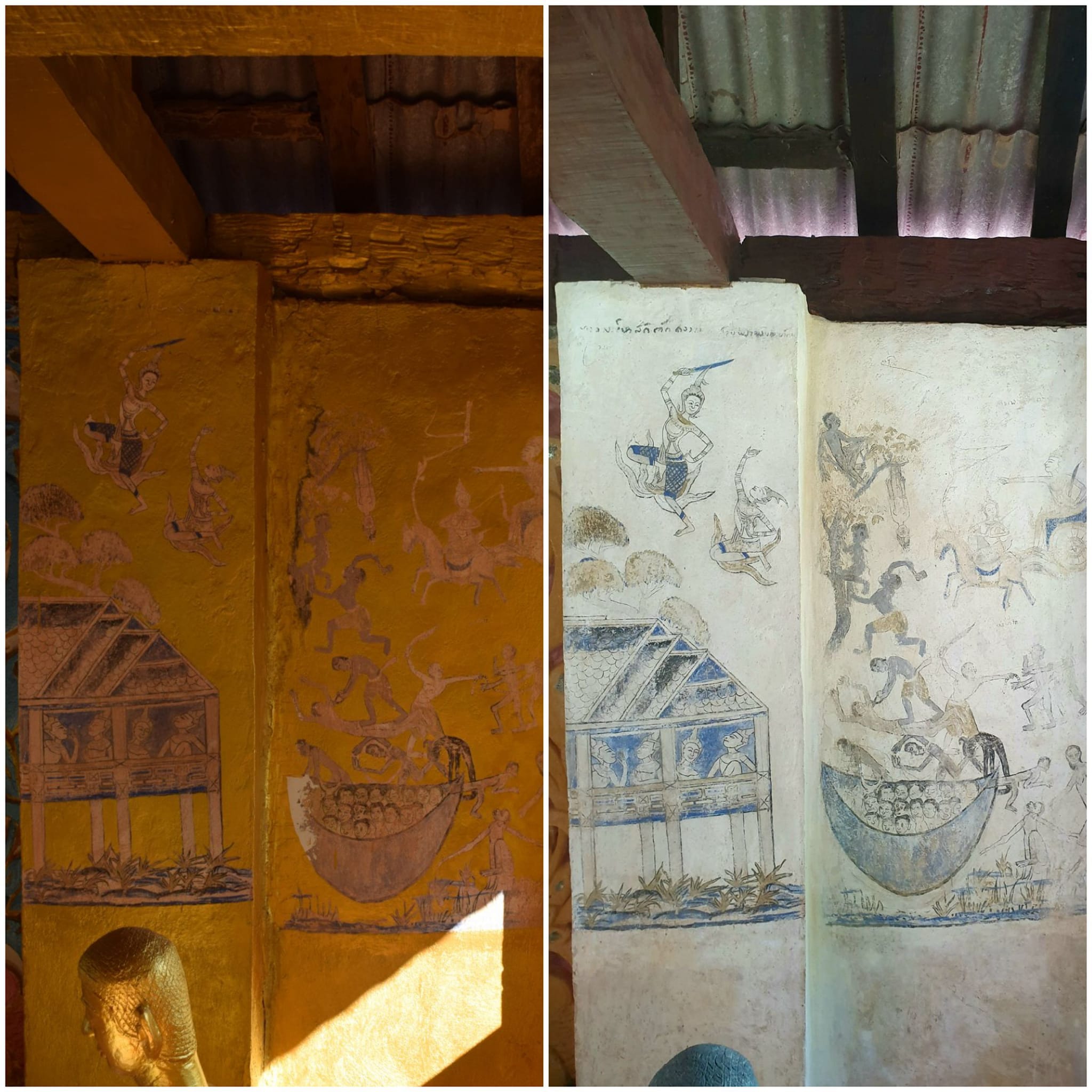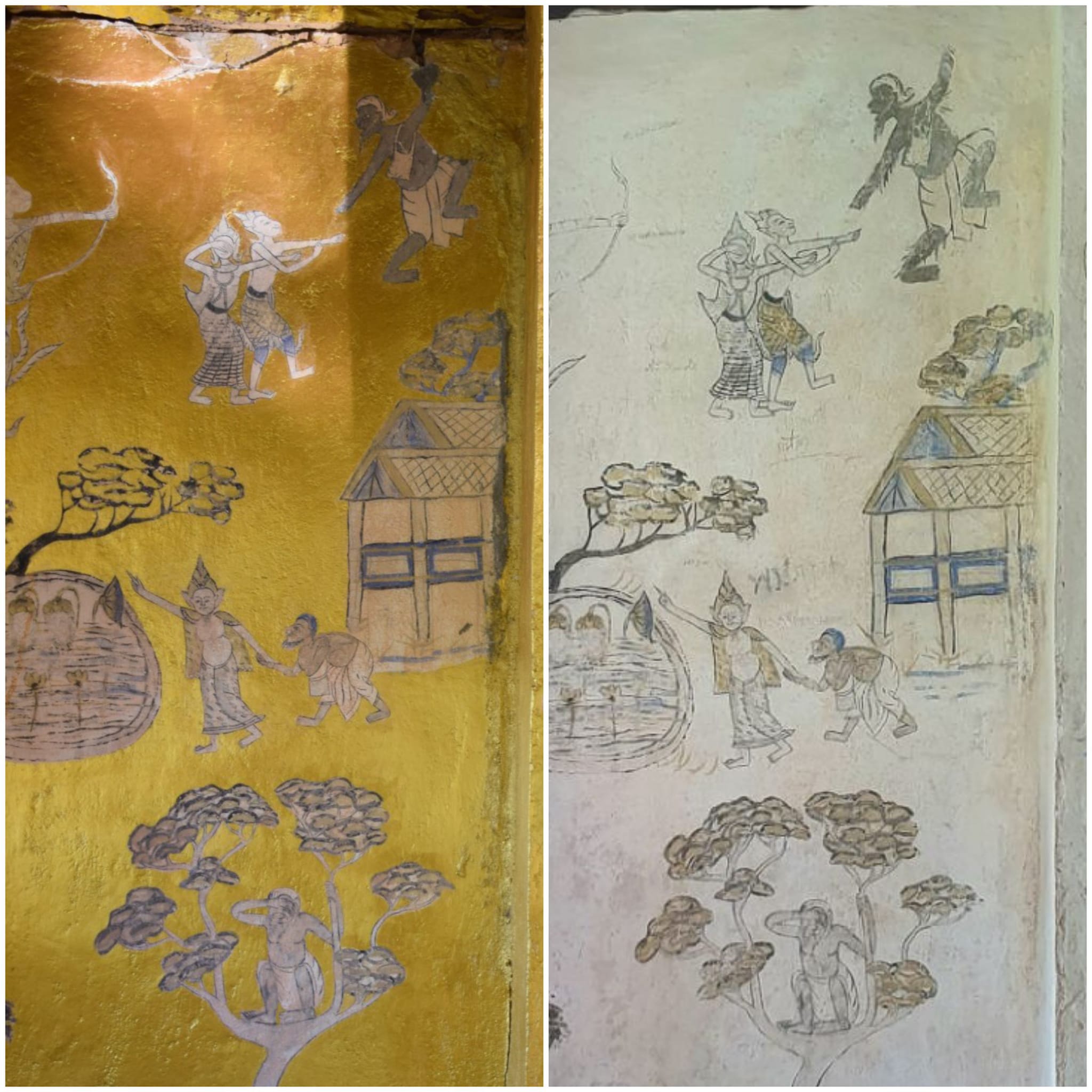 ภาพแสดงเปรียบเทียบก่อนและหลังการอนุรักษ์จิตรกรรมฝาผนัง