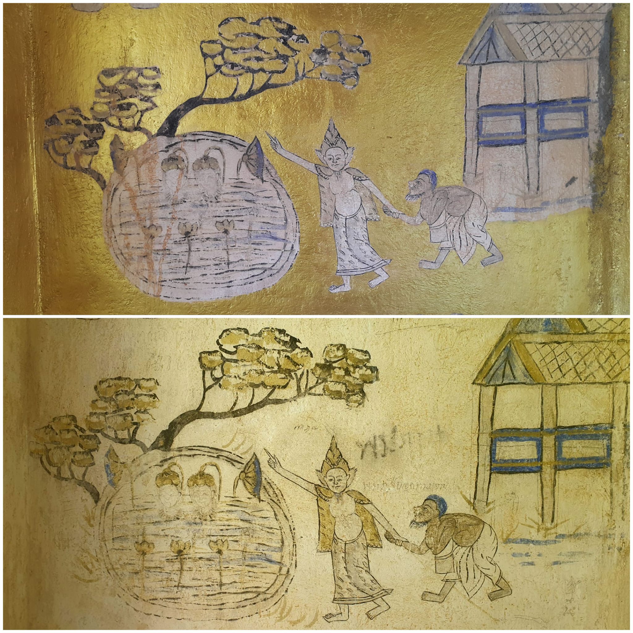 ภาพแสดงเปรียบเทียบก่อนและหลังการอนุรักษ์จิตรกรรมฝาผนัง