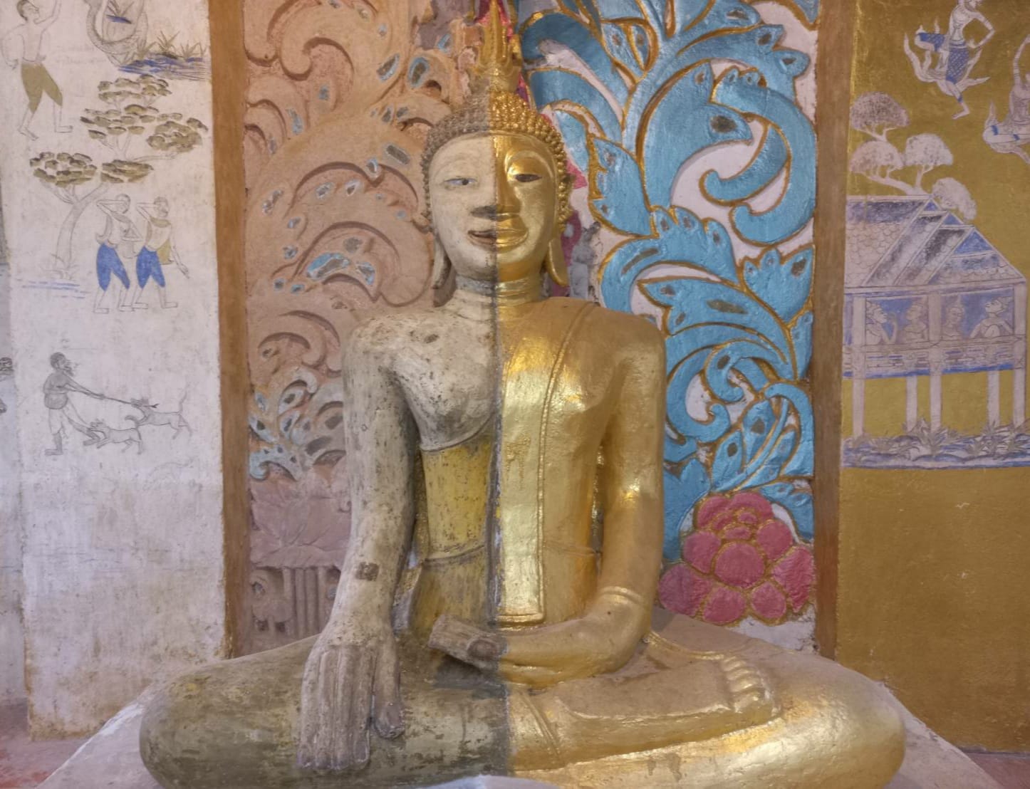 ภาพแสดงเปรียบเทียบก่อนและหลังการอนุรักษ์จิตรกรรมฝาผนังและประติมากรรมองค์พระ