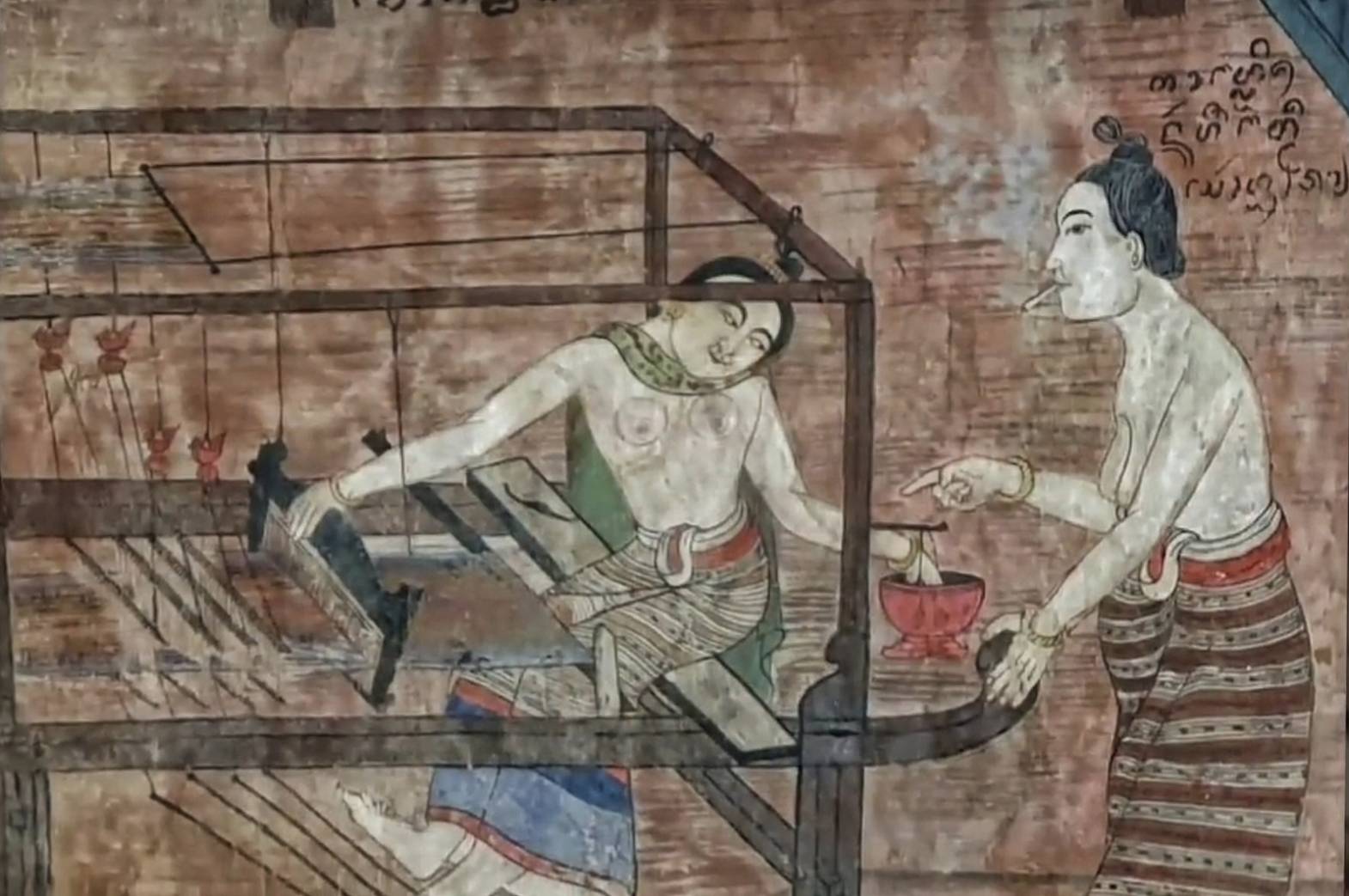 โดยพระอินทร์แปลงร่างเป็นพญาช้างเผือกลงมาเหยียบย้ำข้าวในที่นาของหญิงหม้าย นางผู้ที่มีฝีมือในการทอผ้าและสอนวิชาการทอผ้าให้กับหญิงชาวเมืองจนเป็นที่รักใคร