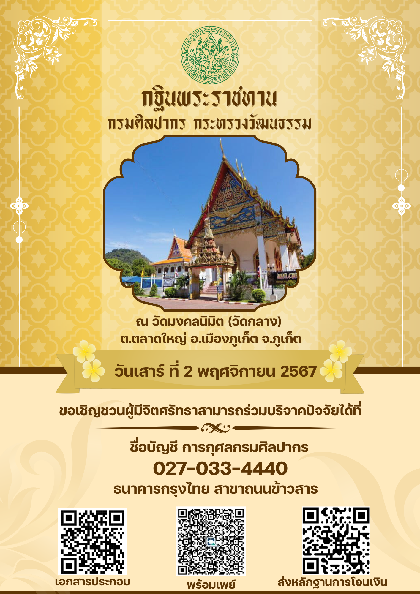 ขอเชิญชวนผู้มีจิตศรัทธาร่วมอนุโมทนาบุญในการถวายผ้ากฐินพระราชทาน กรมศิลปากร ประจำปีพุทธศักราช 2567 ณ วัดมงคลนิมิต (วัดกลาง) ตำบลตลาดใหญ่ อำเภอเมืองภูเก็ต จังหวัดภูเก็ต ในวันเสาร์ที่ 2 พฤศจิกายน 2567