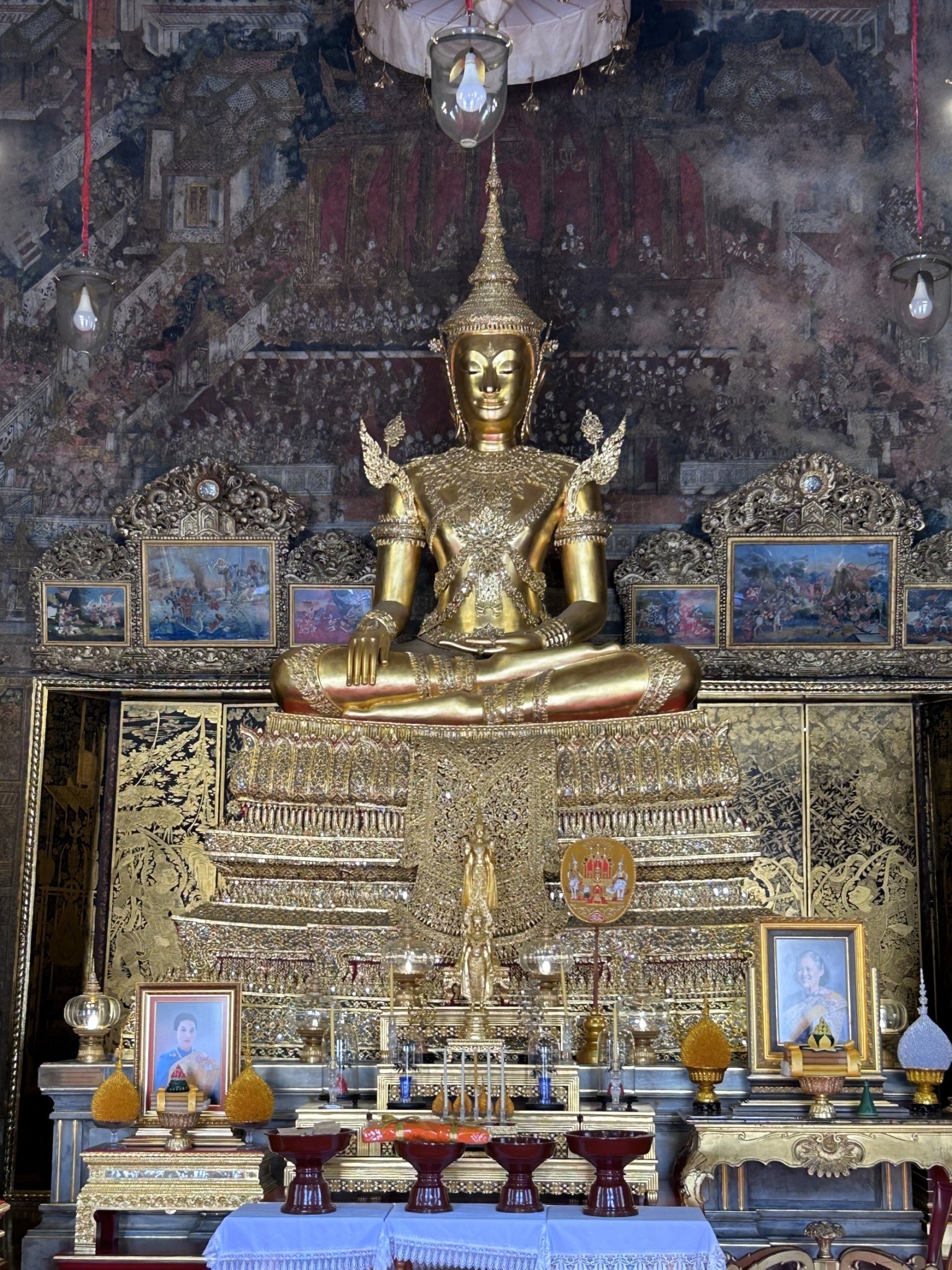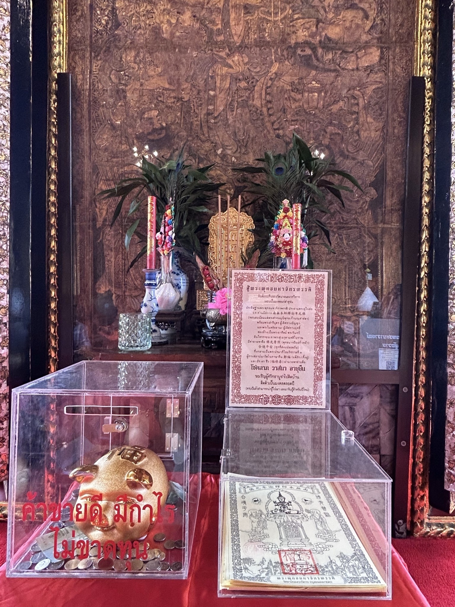 ภายในอาคารพระอุโบสถ ประดิษฐานพระพุทธมหาจักรพรรดิ เป็นพระพุทธรูปทรงเครื่อง ปางมารวิชัย ประทับขัดสมาธิราบหล่อด้วยสำริดลงรักปิดทองเครื่องทรงทุกชิ้นสามารถถอดแยกได้ พระพักตร์อย่างพุทธศิลป์สุโขทัย หน้าตักกว้าง ๑ เมตร ๒๕ เซนติเมตร ประดิษฐานอยู่บนฐานชุกชีประดับลายปูนปั้นปิดทองประดับกระจก นอกจากนี้ ผนังเขียนภาพจิตรกรรม เป็นภาพจิตรกรรมไทยประเพณีเล่าเรื่องท้าวมหาชมพูบริเวณเหนือกรอบหน้าต่าง และภาพกำมะลอเรื่องสามก๊กที่เขียนเล่าเรื่องแบ่งออกเป็นตอน ๆ ในช่องรูปสี่เหลี่ยมจัตุรัสบริเวณผนังระหว่างบานประตูและบานหน้าต่างทั้ง ๔ ด้าน ส่วนผนังระหว่างกรอบประตูทั้ง ๒ ด้านประดับลวดลายมงคลอย่างจีน ได้แก่ รูปฮก ลก ซิ่ว ที่ผนังสกัดทางหน้าของพระพุทธรูปประธาน และลวดลาย นกกระเรียน ที่ผนังสกัดด้านหลัง