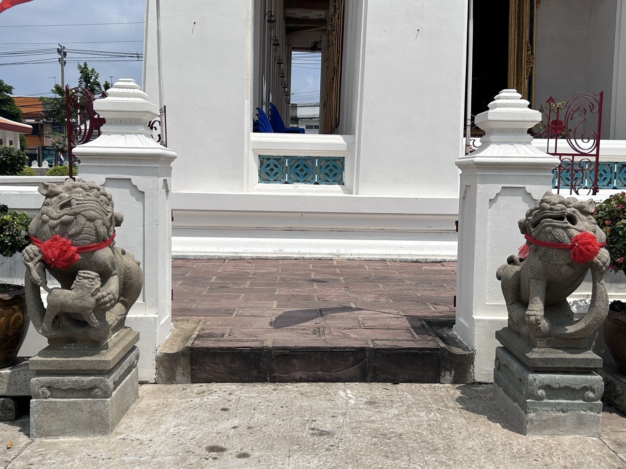 ๓. พระวิหารคู่ (ทิศเหนือและทิศใต้) เป็นอาคาร ๒ หลังตั้งขนานกันบริเวณหน้าวัด พระวิหารมีขนาดกว้าง ๕ ช่วงเสา มีหลังคาปีกนกล้อมรอบระเบียงรับด้วยเสาพาไลสี่เหลี่ยมขนาดใหญ่ หลังคาพระวิหารทิศเหนือเป็นหลังคาทรงจั่วลดชั้นหน้า-หลัง ซ้อนชั้น ๓ ตับ แต่พระวิหารด้านใต้ซ้อน ๒ ตับ หน้าบันของอาคารมีลักษณะแบบปิดหรือทึบตัน หน้าบันทั้งตับที่ ๑ ตกแต่ง ด้วยกระเบื้องเคลือบอย่างประณีตเป็นภาพหงส์และมังกร ส่วนตับที่ ๒ เป็นภาพทิวทัศน์ และสถาปัตยกรรมแบบจีนหรือถะ ส่วนหน้าบันของพระวิหารหลังทิศใต้ตกแต่งเป็นลายมังกรคู่กำลังเล่นลูกไฟ ประกอบเครื่องมงคลจีนต่าง ๆ กัน ภายในพระวิหารทิศเหนือประดิษฐานพระพุทธรูป “หลวงพ่อผุด” ฝีมือช่างอยุธยาตอนปลาย โดยตั้งอยู่ด้านหน้า “หลวงพ่อผาด” ซึ่งเป็นพระพุทธรูปประธานองค์เดิม พระพุทธรูปทั้ง ๒ องค์นั้น เป็นพระพุทธรูปปูนปั้นปางมารวิชัยขนาดใหญ่ ประดิษฐานอยู่บนฐานสิงห์ ลักษณะทางประติมากรรม และการจัดวางประดิษฐานเทียบได้กับพระพุทธรูปในสมัยอยุธยาตอนปลาย ทำให้เชื่อว่าน่าจะมีการเปลี่ยนแปลงอุโบสถหลังเก่าหลังนี้ให้เป็นวิหารในรัชกาลที่ ๓ ฝ้าเพดาน ภายในวิหารหลังนี้ทาสีแดง ส่วนในพระวิหารทิศใต้ ประดิษฐานพระประธานขนาดเล็กปางมารวิชัย ห่มจีวรลายดอก อันเป็นลักษณะที่เกิดขึ้นในสมัยรัชกาลที่ ๓ จึงสันนิษฐานว่าได้หล่อขึ้นใหม่ เพื่อประดิษฐานในพระวิหารโดยเฉพาะ พระวิหารแต่ละหลังล้อมด้วยกำแพงแก้วเตี้ย ๆ มีปรางค์จำลองขนาดเล็กที่มุมกำแพง บริเวณด้านหลังของพระวิหารก่อปรางค์หกเหลี่ยมยกเก็จคร่อมอยู่บนกำแพงแก้ว
