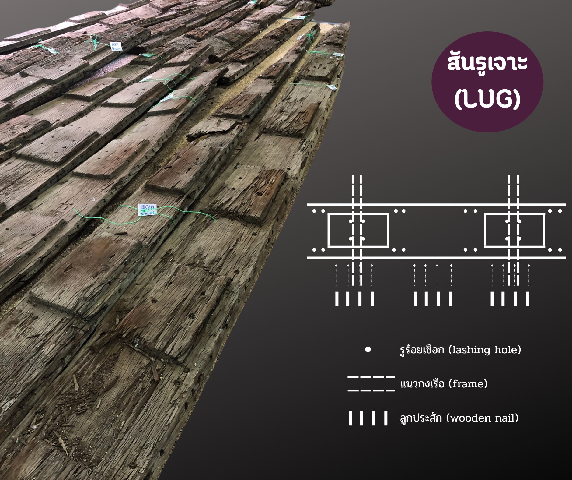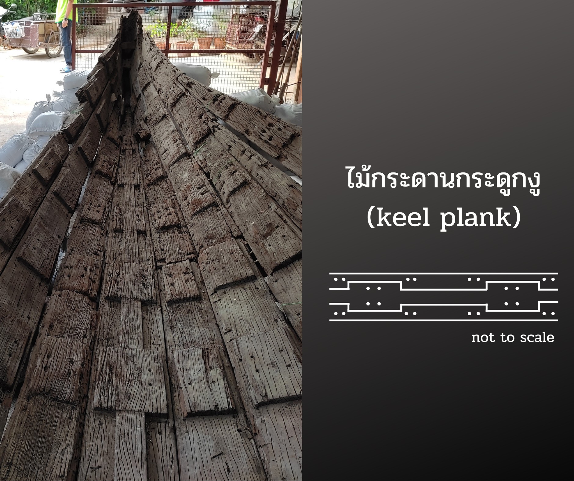 ไม้กระดานเรือแต่ละแผ่น มีการเจาะรูที่ด้านสันของไม้ตลอดความยาว อีกทั้งยังพบลูกประสักหรือสลักไม้สวนอยู่ในรูบางส่วน นอกจากนี้ที่แผ่นกระดานเปลือกเรือด้านในมีการทำปุ่มสันทรงสี่เหลี่ยมผืนผ้านูนออกมาจากระดับพื้นกระดาน ยาวตลอดความยาวของแผ่นเปลือกเรือ