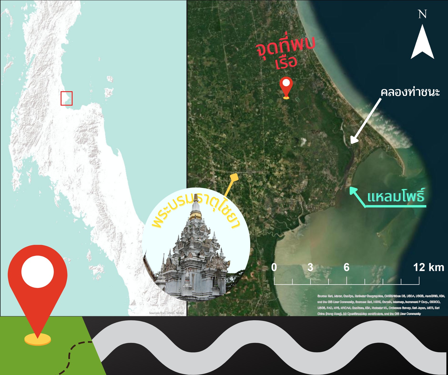 ซากเรือบ้านคลองยวน สำรวจพบที่บ้านเลขที่ ๑๑๙/๒ หมู่ที่ ๘ บ้านคลองยวน ตำบลทุ่ง อำเภอไชยา จังหวัดสุราษฎร์ธานี