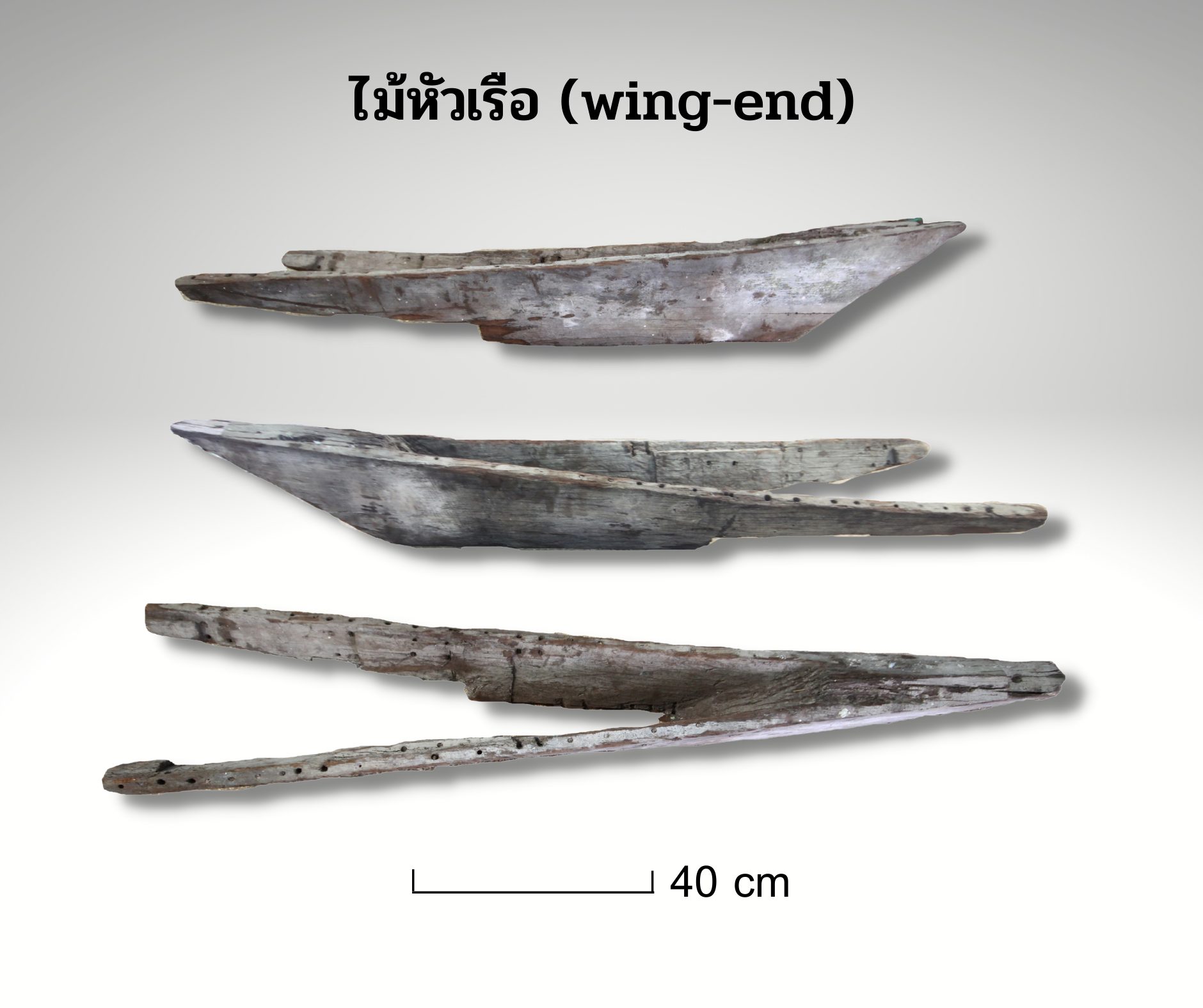 เป็นที่น่าสังเกตว่าหัวและท้ายเรือแบบ wing-end นั้น มีขนาดค่อนข้างใหญ่และทำจากไม้ชิ้นเดียว เป็นไปได้ว่าช่างในสมัยนั้นอาจนำไม้จากบริเวณของโคนต้นมาผ่าตามแนวขวางแล้วจึงแกะให้เป็นรูปตัว V ดังสังเกตได้จากวงปีไม้ที่มีลักษณะเป็นวงวางตัวขวางกับแนวเรือ ส่วนกลางลำต้นจะนำไปทำไม้กระดาน
