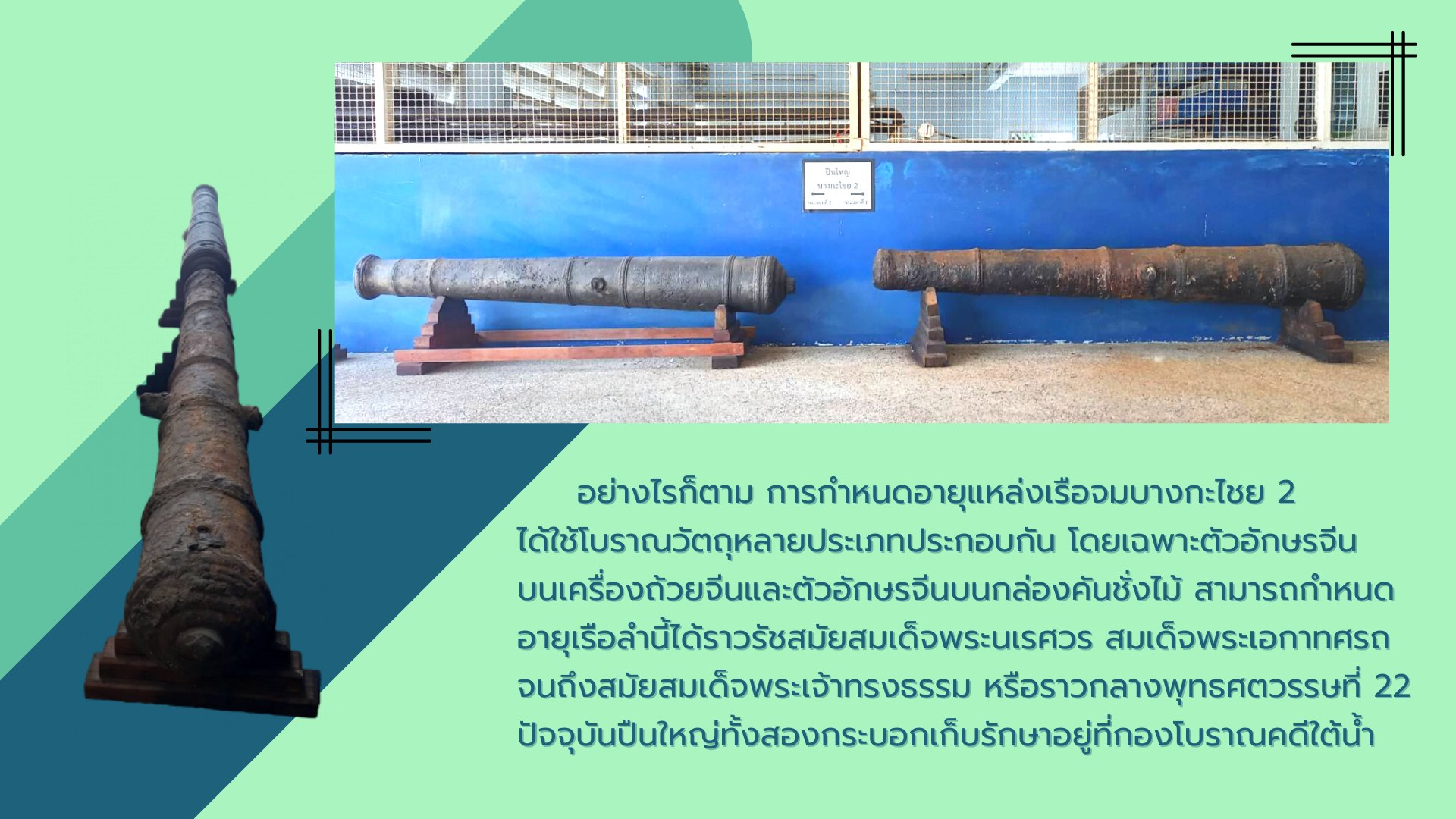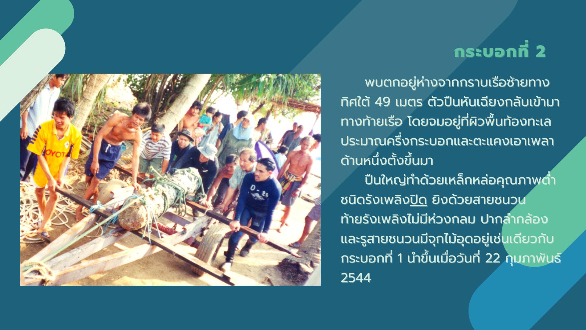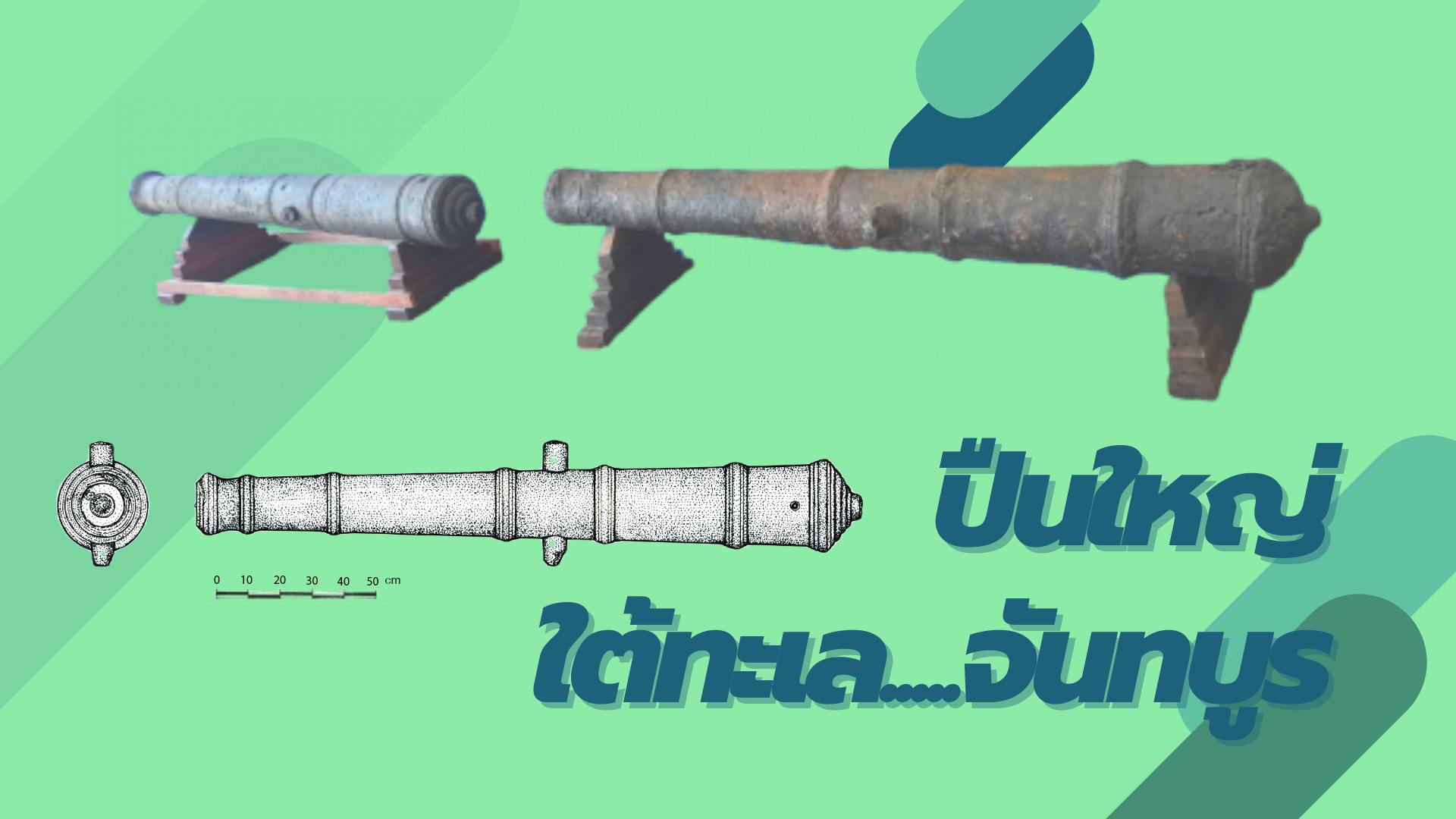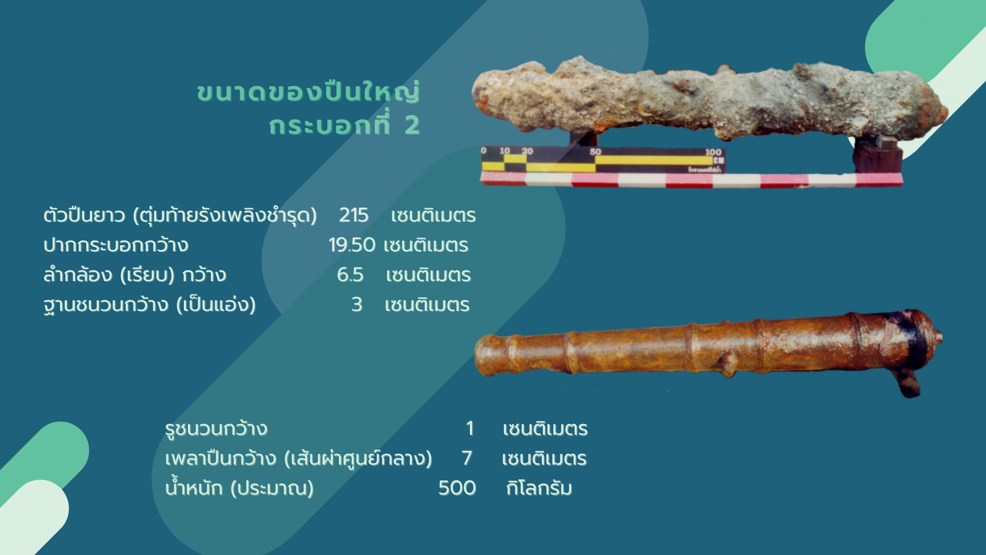 พบปืนใหญ่จำนวน 2 กระบอก ซึ่งใช้เป็นอาวุธประจำเรือ ที่สามารถป้องกันการบุกรุกจากเรือโจรสลัดได้ในระยะไกล วันนี้จึงขอนำเสนอเกร็ดความรู้เกี่ยวกับหลักฐานปืนใหญ่ที่พบจากแหล่งเรือจมลำนี้