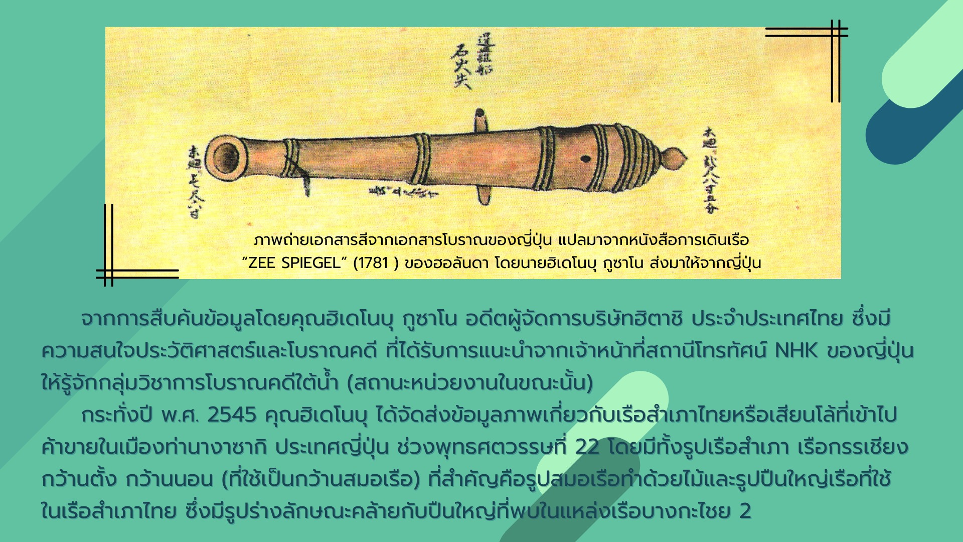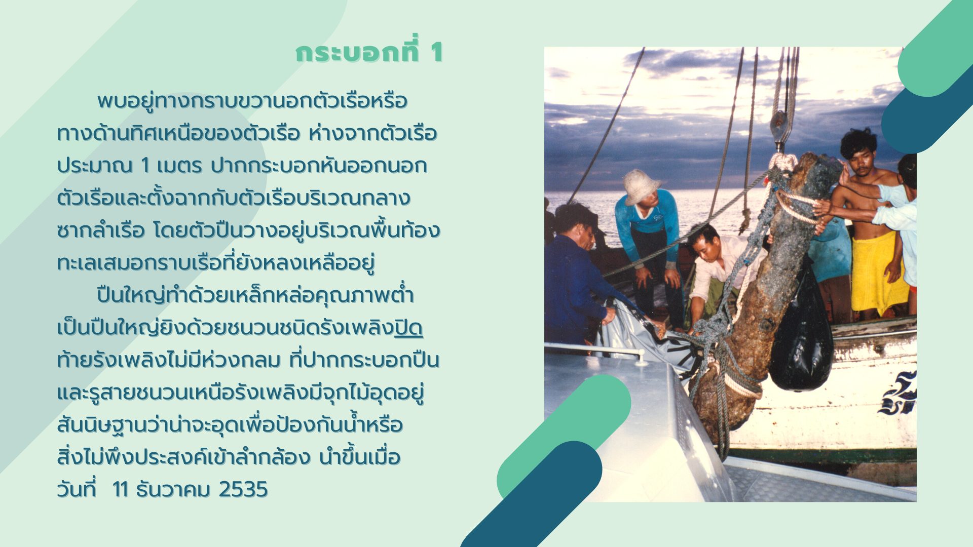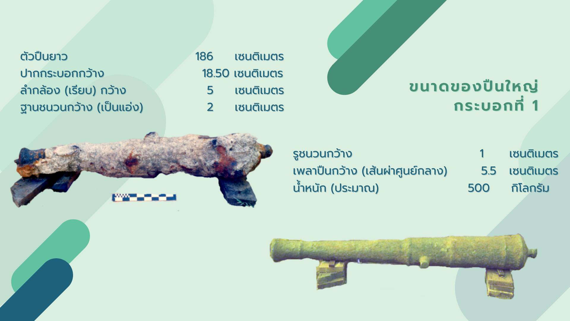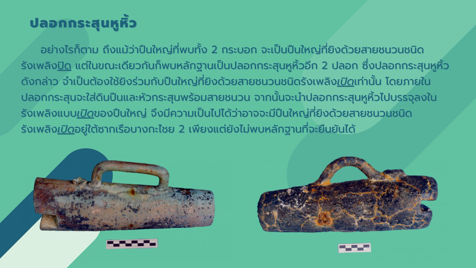 พบปืนใหญ่จำนวน 2 กระบอก ซึ่งใช้เป็นอาวุธประจำเรือ ที่สามารถป้องกันการบุกรุกจากเรือโจรสลัดได้ในระยะไกล วันนี้จึงขอนำเสนอเกร็ดความรู้เกี่ยวกับหลักฐานปืนใหญ่ที่พบจากแหล่งเรือจมลำนี้