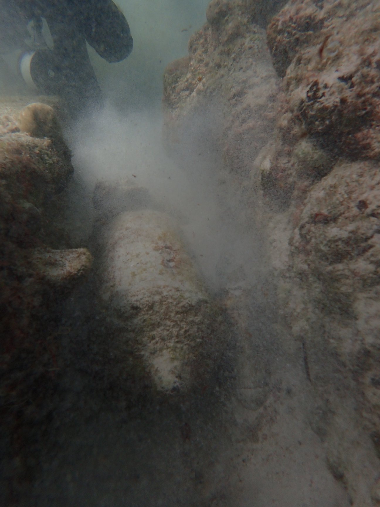 สภาพแรกที่เห็นคือแท่นขนาดใหญ่ลักษณะเป็นที่เหลี่ยมคางหมู มีขนาดประมาณ ๑๒๐ x ๙๐ เซนติเมตร สูงไม่ต่ำกว่า ๗๐ เซนติเมตรจม ถัดมาเป็นวัตถุรูปทรงคล้ายปืนใหญ่จมอยู่ใต้ผิวทรายกว่าครึ่ง พื้นผิวภายนอกมีสนิมปกคลุม เบื้องต้นจึงจึงวิธีการเปิดพื้นผิวที่ปกคลุมวัตถุด้วยการโบกด้วยมือ (Hand Fan) เพื่อให้เห็นสภาพโดยรวมของวัตถุทั้งหมด ซึ่งมีขนาดความยาวประมาณ ๑ เมตร กว้างประมาณ ๒๐ เซนติเมตร เมื่อเห็นลักษณะรูปทรงทั้งหมดแล้วทีมงานกลับพบกับความแปลกใจเมื่อพบว่าวัตถุคล้ายปืนใหญ่นั้นถูกเชื่อมติดกันกับแท่นโลหะด้วยเหล็กฉาก ซึ่งหากเป็นปืนใหญ่โบราณจริงไม่ควรเป็นแบบนั้น ไม่เพียงเท่านี้ขนาดโดยรวมของปืนใหญ่ยังดูไม่สมมาตรเนื่องจากปากกระบอกปืนนั้นมีขนาดพอๆกันกับท้ายกระบอกปืน อีกทั้งรูที่สันนิษฐานว่าเป็นรูใส่กระสุนปืนยังมีขนาดใหญ่มากเมื่อเทียบกับตัวกระบอกปืน นั่นทำให้ตัวปืนมีความบางเกินกว่าที่จะเป็นปืนใหญ่ จากข้อสังเกตุดังกล่าวทำให้สรุปว่าวัตถุดังกล่าวนั้นเป็นท่อเหล็กที่ปลายด้านหนึ่งบานออกคล้ายปากกระบอกปืน ส่วนที่ท้ายปืนมีปุ่มยืนออกมาคล้ายกับท้ายปืนใหญ่ เมื่อถูกปกคลุมด้วยสนิมจึงมีลักษณะคล้ายคลึงกับปืนใหญ่โบราณ เมื่อสรุปได้ดังนั้น ทางทีมงานตัดสินใจที่จะนำท่อเหล็กดังกล่าวขึ้นเพื่อนำเก็บบันทึกและมาตรวจสอบต่อไป