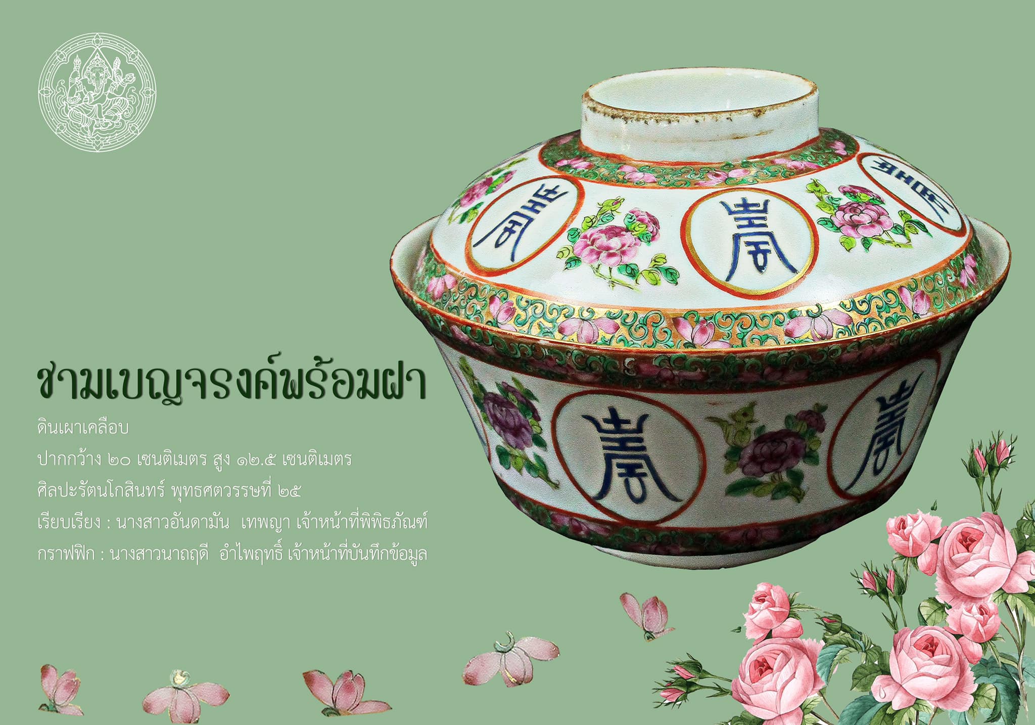 ชามเบญจรงค์พร้อมฝาลักษณะเป็นเครื่องถ้วยประเภทเนื้อดินเผาเคลือบสีขาว ตัวชามปากกว้าง ขอบปากผาย ก้นลึก ใต้ก้นมีเชิงสั้นตัวฝาปิดมีลักษณะคล้ายชาม และมีขอบเชิงสำหรับจับ เมื่อนำฝามาครอบ ตัวฝาจะต่ำกว่าขอบปากเล็กน้อยด้านในชามสีขาวไม่มีลวดลาย ด้านนอกตกแต่งด้วยการเขียนสีลายน้ำทองรูปดอกเหมยสีชมพู และเขียนอักษรจีนในวงกลม บริเวณด้านข้างของชามและฝา สภาพขอบปากบิ่น และมีรอยร้าว