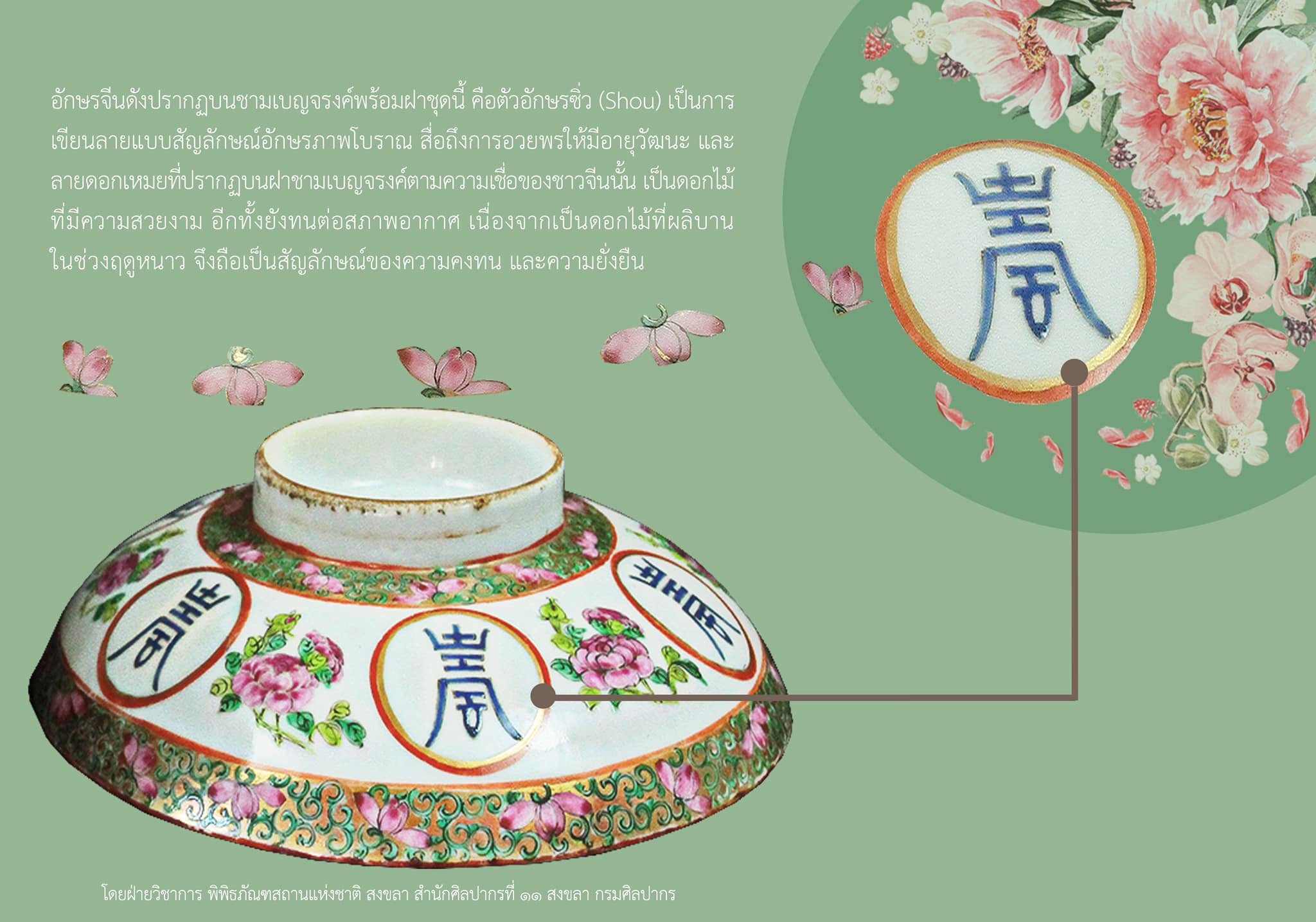 อักษรจีนดังปรากฏบนชามเบญจรงค์พร้อมฝาชุดนี้ คือตัวอักษรซิ่ว (Shou) เป็นการเขียนลายแบบสัญลักษณ์อักษรภาพโบราณ สื่อถึงการอวยพรให้มีอายุวัฒนะ และลายดอกเหมยที่ปรากฏบนชามฝาเบญจรงค์ตามความเชื่อของชาวจีนนั้น เป็นดอกไม้ที่มีความสวยงามอีกทั้งยังทนต่อสภาพอากาศ เนื่องจากเป็นดอกไม้ที่ผลิบานในช่วงฤดูหนาว จึงถือเป็นสัญลักษณ์ของความคงทน และความยั่งยืน
