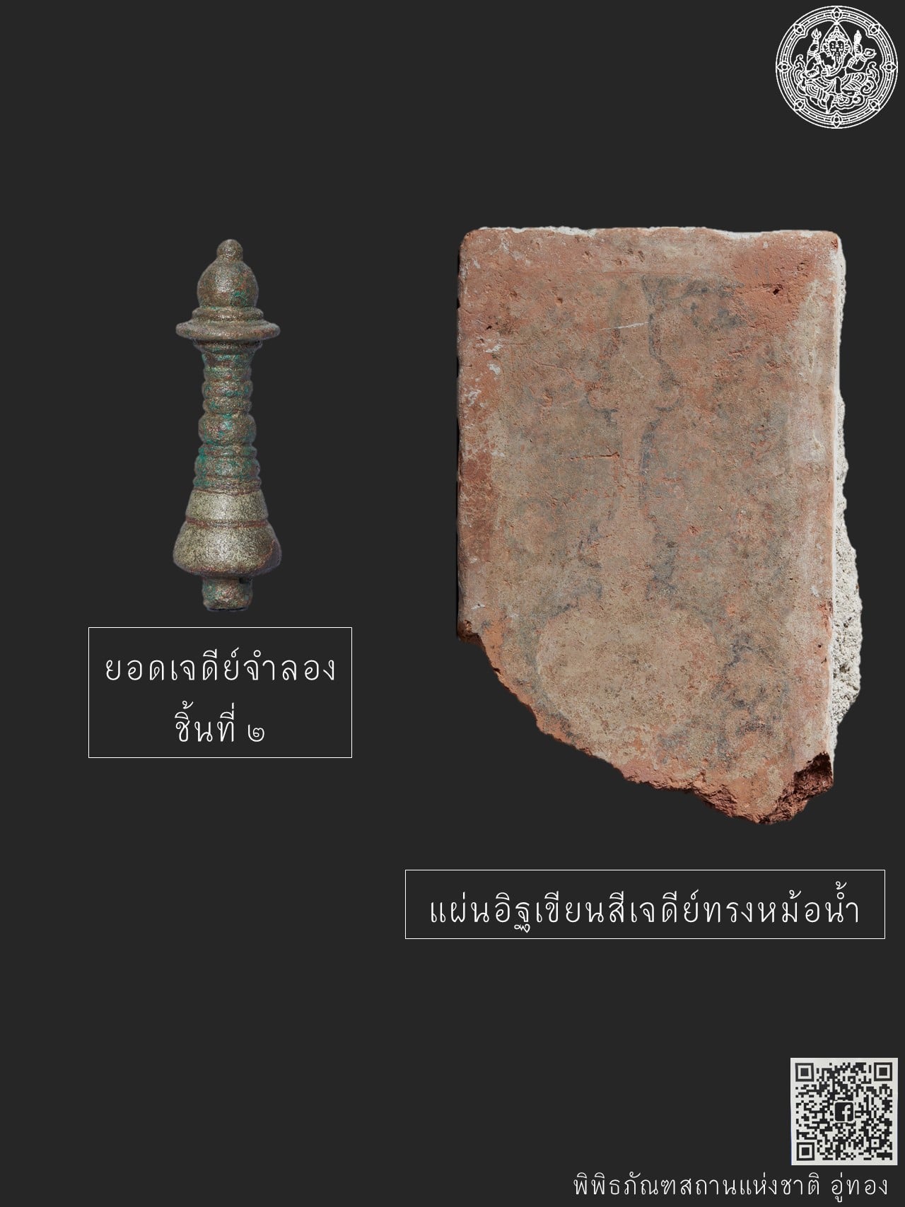 ยอดเจดีย์จำลอง ทำด้วยสำริด จำนวน ๒ ชิ้น พบจากเจดีย์หมายเลข ๑๓ เมืองโบราณอู่ทอง อำเภออู่ทอง จังหวัดสุพรรณบุรี จัดแสดง ณ ห้องอู่ทองศรีทวารวดี พิพิธภัณฑสถานแห่งชาติ อู่ทอง
