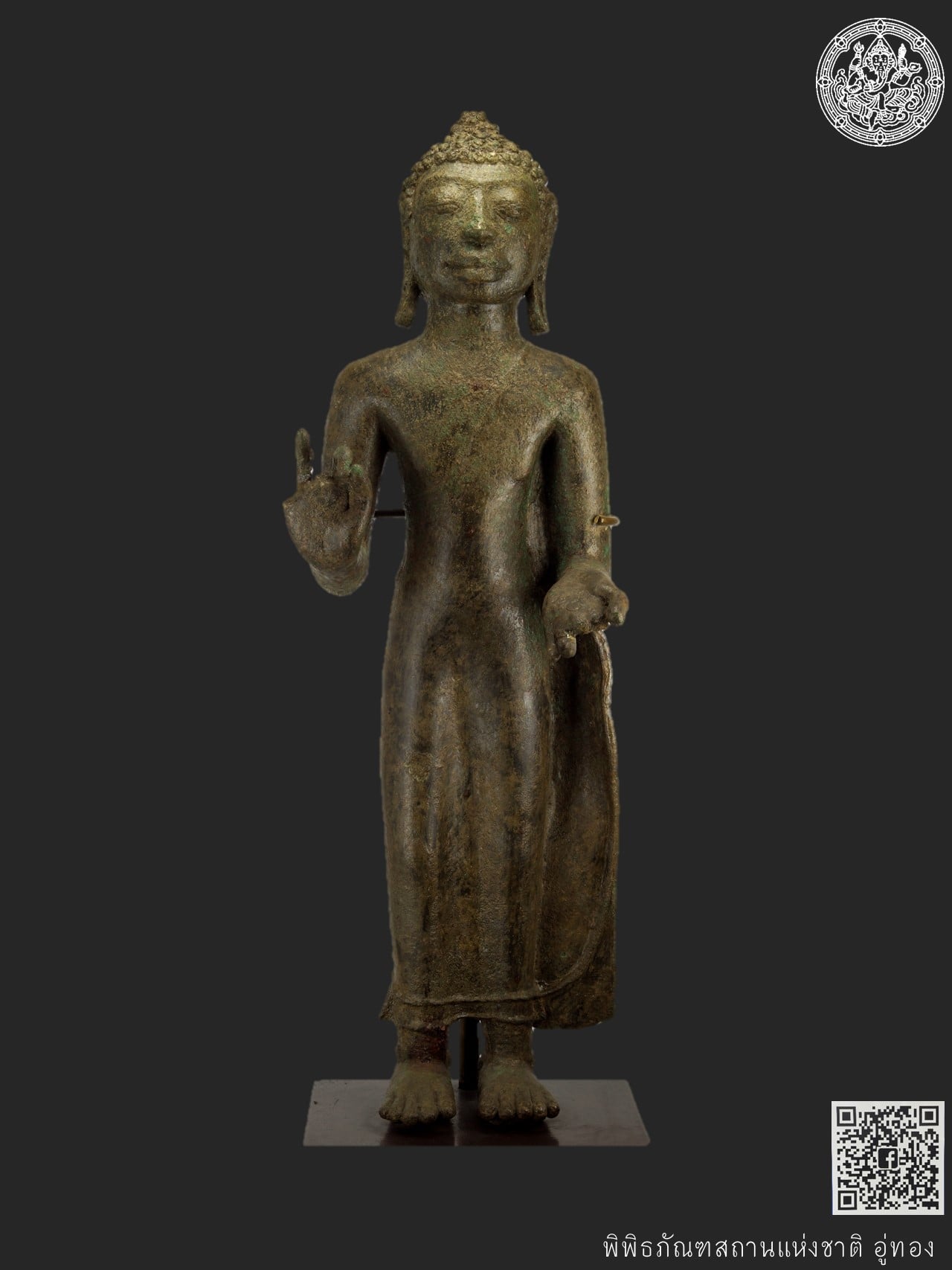 พระพุทธรูปยืนปางแสดงธรรม พบจากเจดีย์หมายเลข ๓ เมืองโบราณอู่ทอง อำเภออู่ทอง จังหวัดสุพรรณบุรี จัดแสดง ณ ห้องบรรพชนคนอู่ทอง พิพิธภัณฑสถานแห่งชาติ อู่ทอง