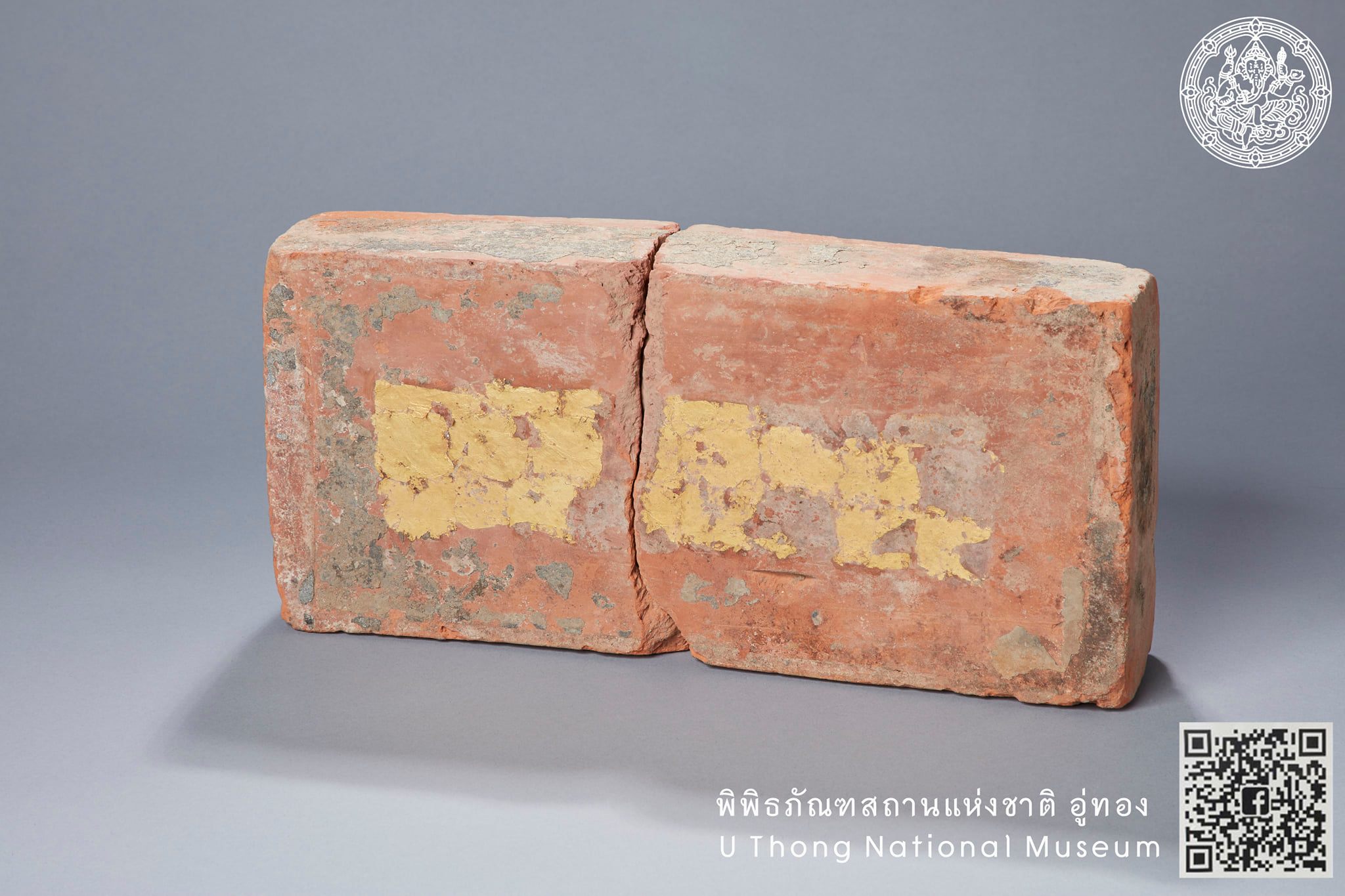 แผ่นอิฐปิดทองคำเปลว จำนวน ๒ แผ่น จัดแสดง ณ อาคารจัดแสดง ๒ พิพิธภัณฑสถานแห่งชาติ อู่ทอง