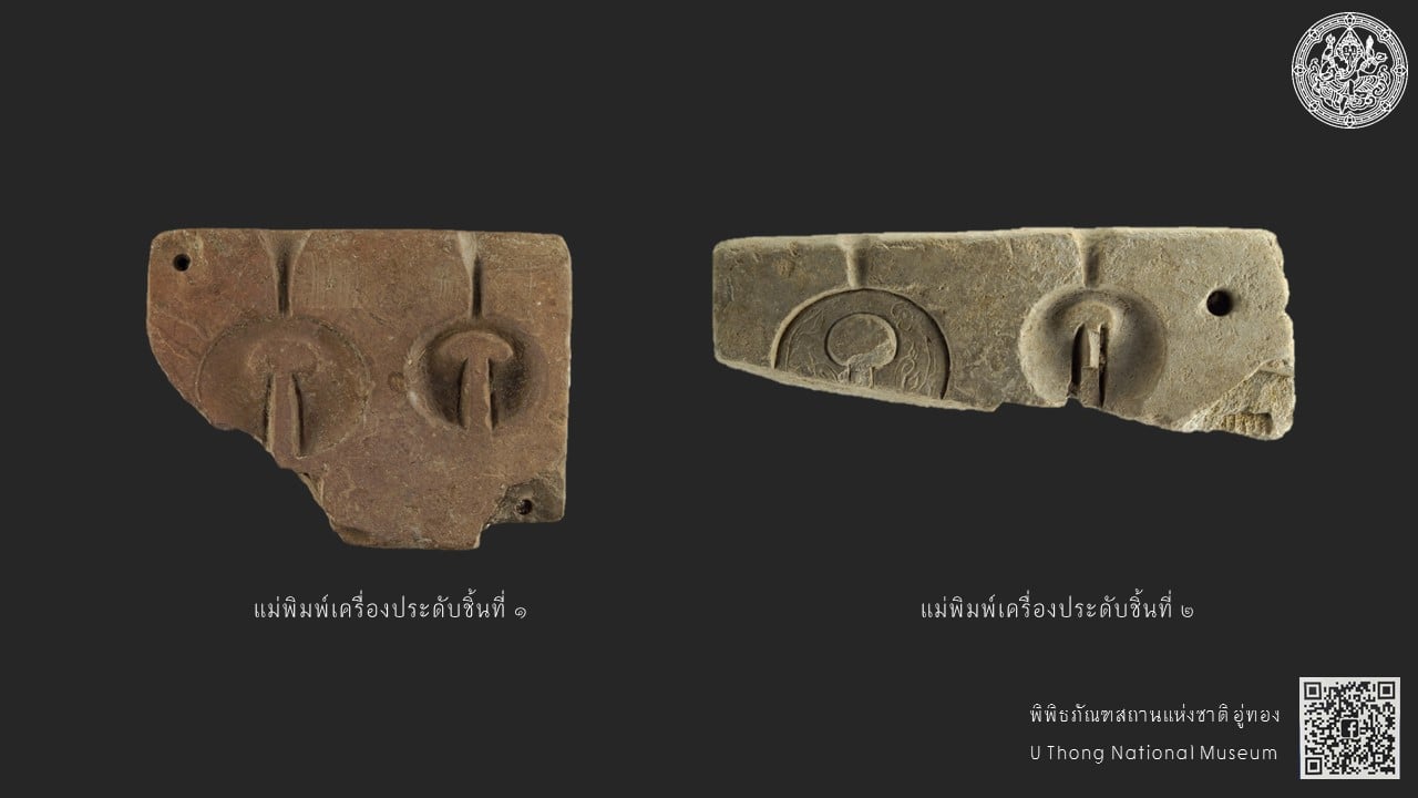 แม่พิมพ์เครื่องประดับ จำนวน ๒ ชิ้น พบบริเวณเมืองโบราณอู่ทอง จัดแสดง ณ ห้องอู่ทองศรีทวารวดี พิพิธภัณฑสถานแห่งชาติ อู่ทอง