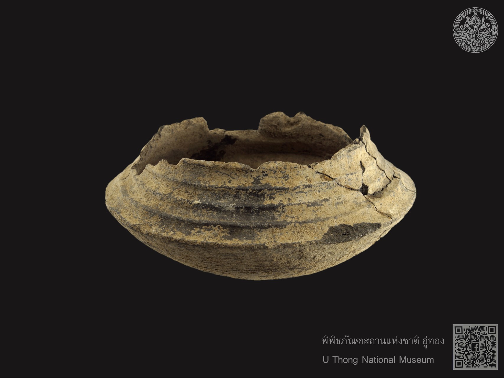 ภาชนะดินเผามีสัน พบที่เมืองโบราณอู่ทอง อำเภออู่ทอง จังหวัดสุพรรณบุรี จัดแสดงห้องอู่ทองศรีทวารวดี พิพิธภัณฑสถานแห่งชาติ อู่ทอง
