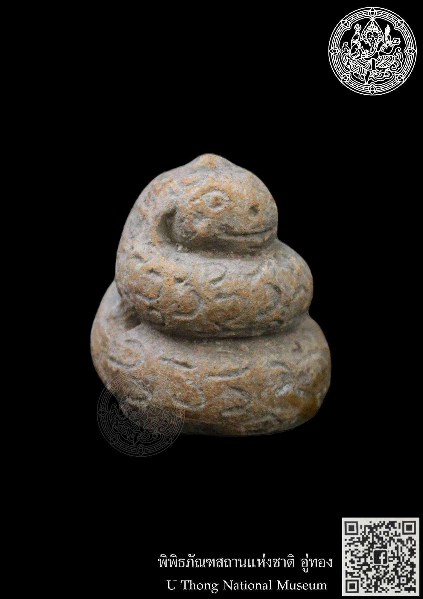 ประติมากรรมดินเผารูปนาค สูง ๔ เซนติเมตร กว้าง ๓.๓ เซนติเมตร มีขนดนาคซ้อนเป็นวง ๒ ชั้น รองรับเศียรนาคซึ่งมีลักษณะเหมือนหงอนเป็นตุ่มนูน ใบหน้าและลำตัวของนาค ตกแต่งโดยใช้วัสดุปลายแหลมขีดให้เป็นลูกตากลมโต จมูกเจาะเป็นรูกลม ๒ รู ส่วนปากขีดเป็นเส้นตรงยาว มุมปลายยกขึ้นคล้ายอมยิ้ม ลำตัวตกแต่งเป็นขีดคล้ายเกล็ดงู