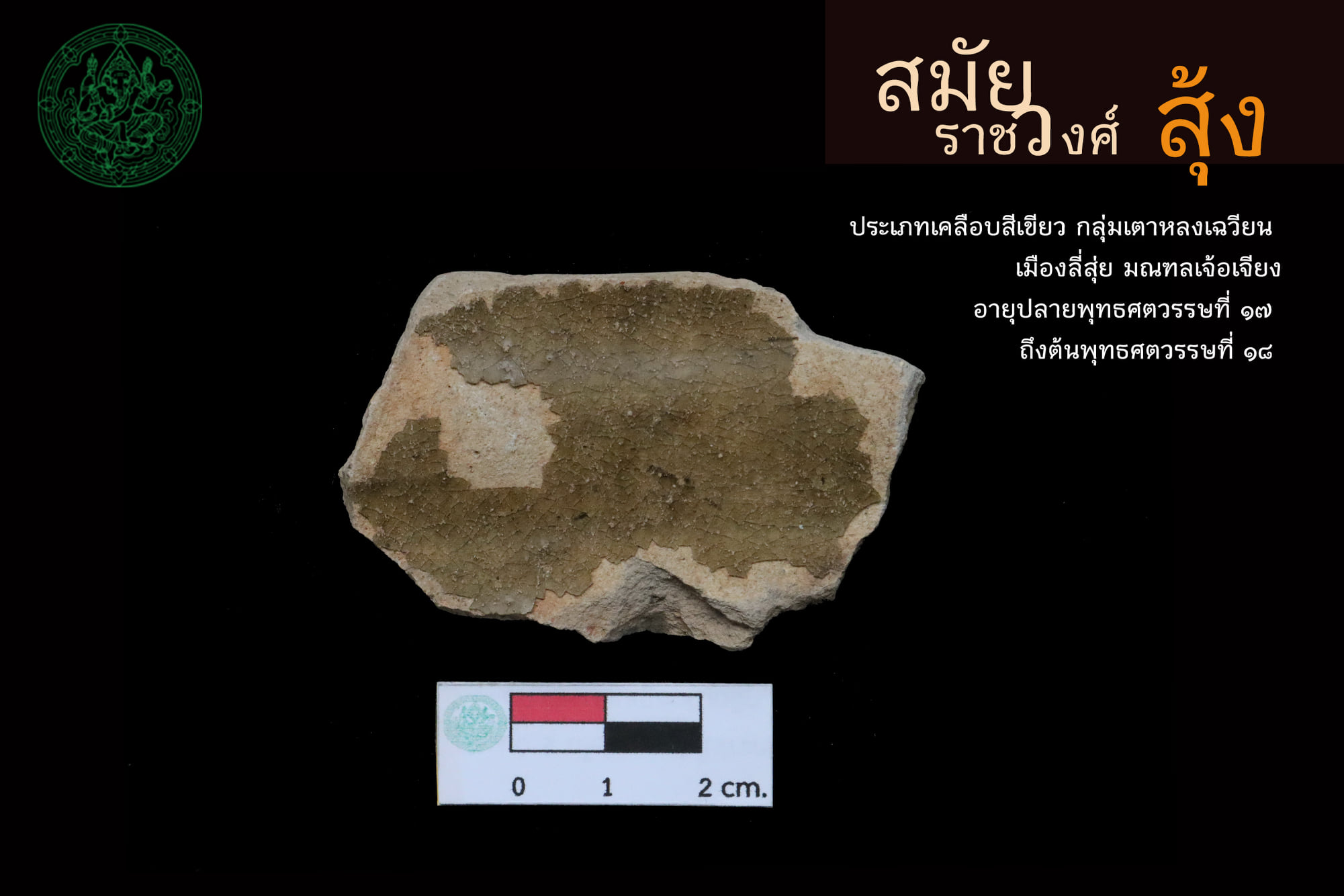๑. สมัยราชวงศ์สุ้ง พุทธศตวรรษที่ ๑๗ – ๑๙ ส่วนใหญ่เป็นเศษภาชนะดินเผาเคลือบสีเขียว มีแหล่งผลิตจาก “เตาถงอัน มณฑลฝูเจี้ยน” และ “เตาหลงเฉวียน มณฑลเจ้อเจียง” โดยการส่งออกเครื่องปั้นดินเผาในระยะนี้มักพบบริเวณภาคใต้ ภาคตะวันออกและภาคกลางของประเทศไทย