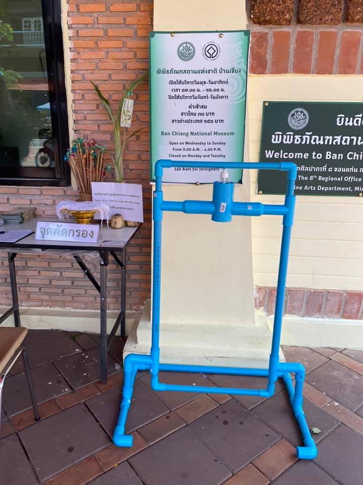 แอลกอฮอล์สำหรับล้างมือที่จุดคัดกรองของ ทางพิพิธภัณฑสถานแห่งชาติ บ้านเชียงได้จัดทำเป็นระบบเหยียบ เรียบร้อยแล้ว