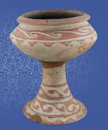 ลักษณะ : ภาชนะดินเผามีฐานสูง มีการตกแต่งด้วยลายเส้นสีแดง และขูดขีดบริเวณไหล่และฐานภาชนะ