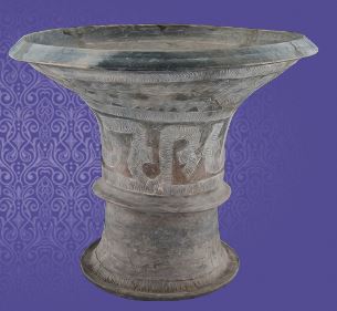 ลักษณะ : ภาชนะดินเผามีเชิง ทรงกระบอก ปากแตร มีการตกแต่งด้วยลาย เชือกทาบ ขูดขีด ปั้นแปะ และรมควันให้เป็นสีดำ