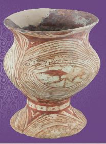 ลักษณะ : ภาชนะดินเผาก้นกลม มีเชิง เขียนสีแดงเป็นลายรูปสัตว์ คล้ายสัตว์เลื้อยคลาน