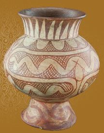 ลักษณะ : ภาชนะดินเผามีเชิง เขียนสีแดงรูปเส้นโค้งบริเวณกลางลำตัวคล้ายงู และลายอื่น ๆ ทั่วทั้งใบ