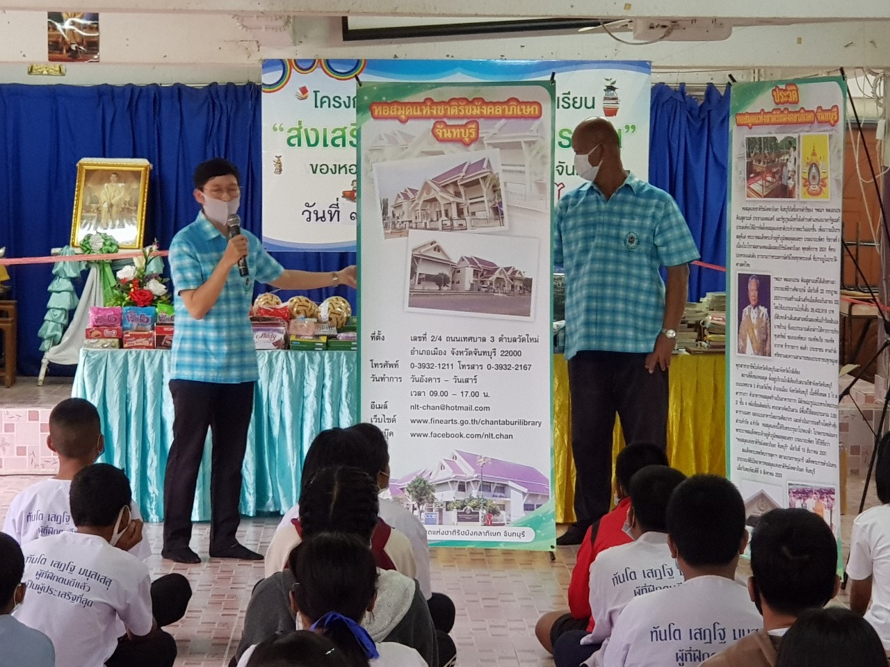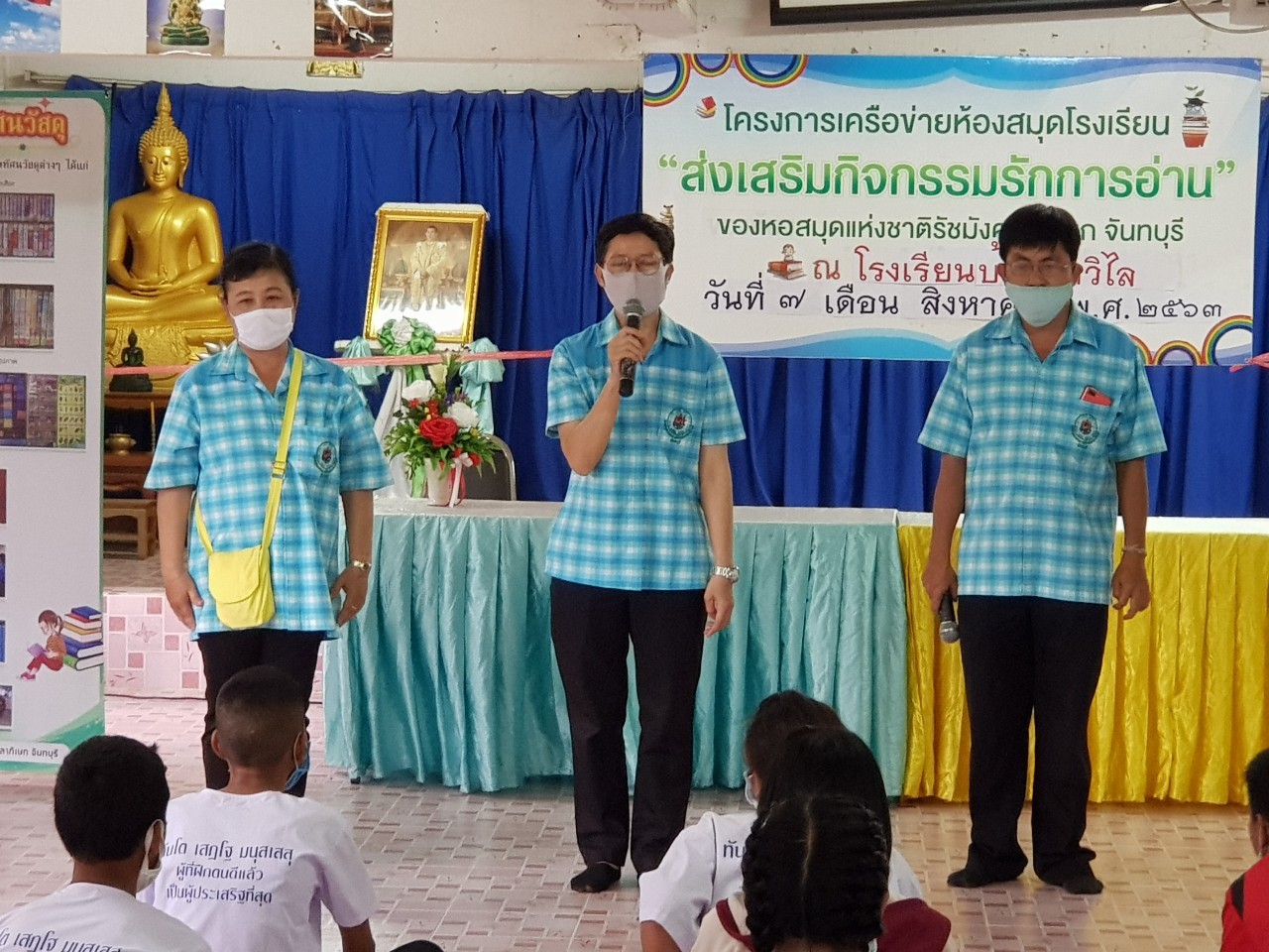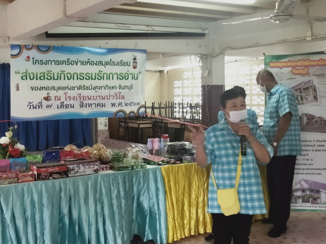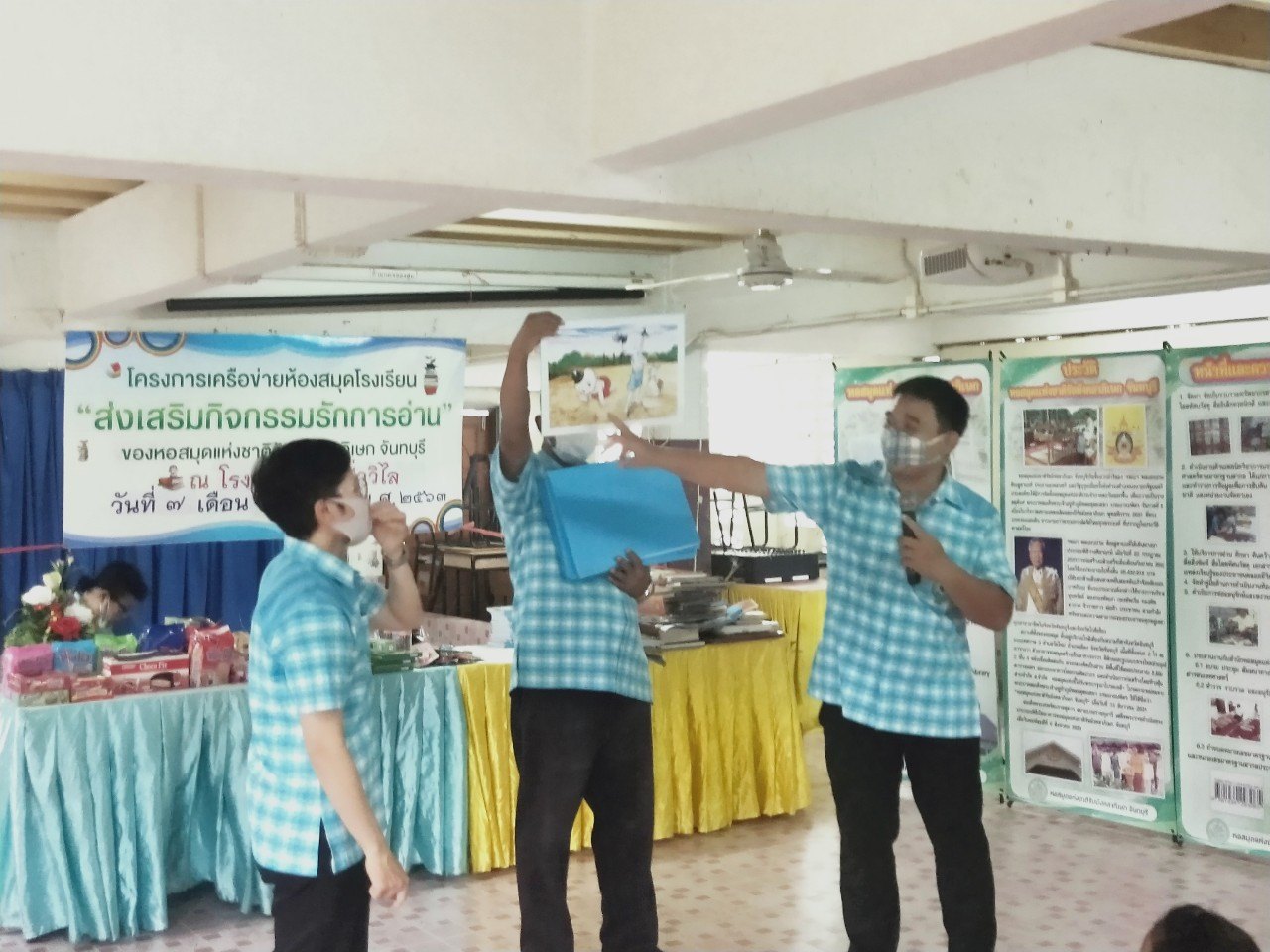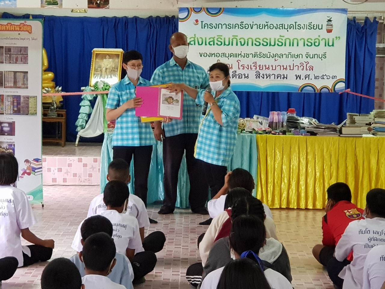 วันศุกร์ที่ 7 สิงหาคม 2563 นางสาวเมษา ครุปิติ บรรณารักษ์ชำนาญการ รักษาการในตำแหน่งผู้อำนวยการหอสมุดแห่งชาติฯ จันทบุรี พร้อมด้วย นายประพนธ์ ร...อบรู้ นักวิชาการโสตทัศนศึกษาชำนาญการ นางกรองแก้ว เปเหล่าดา บรรณารักษ์ชำนาญการ นายสุรศักดิ์ บัวเลียง เจ้าพนักงานห้องสมุดปฏิบัติงาน และนายมานะ กองกูต พนักงานขับรถยนต์ ออกไปจัดกิจกรรมส่งเสริมการอ่าน โครงการเครือข่ายห้องสมุดโรงเรียน ณ โรงเรียนบ้านป่าวิไล ต.คลองใหญ่ อ.โป่งน้ำร้อน จ.จันทบุรี โดยแนะนำให้รู้จักหอสมุด แนะนำสารนิเทศต่างๆ กิจกรรมถามตอบปัญหาอะไรเอ่ย ทายภาพสุภาษิต-คำพังเพย กิจกรรมนันทนาการ ( เตรียมความพร้อม "รหัสปรบมือ" ฝึกท่าทางประกอบการทำมือ เพลงปรบมือ" เพลง"แก้วกะลาขันโอ่ง" และเพลง "ส้มตำมะละกอส้มตำ" เต้นเพลง"ต๊กแก" ) และแข่่งขันเต้นเพลง "ปี้จนป่น" และเพลง "เลิกคุยทั้งอำเภอ" แจกหนังสือส่งเสริมการอ่านแทนการนำหนังสือไปให้อ่าน เพื่อหลีกเลียงการสัมผัสป้องกันโรคไวรัส โควิด-19 โดย ผู้อำนวยการโรงเรียน และคณะครู ให้การต้อนรับ มีนักเรียนชั้น ม.1 - 3 ร่วมกิจกรรม จำนวน 47 คน