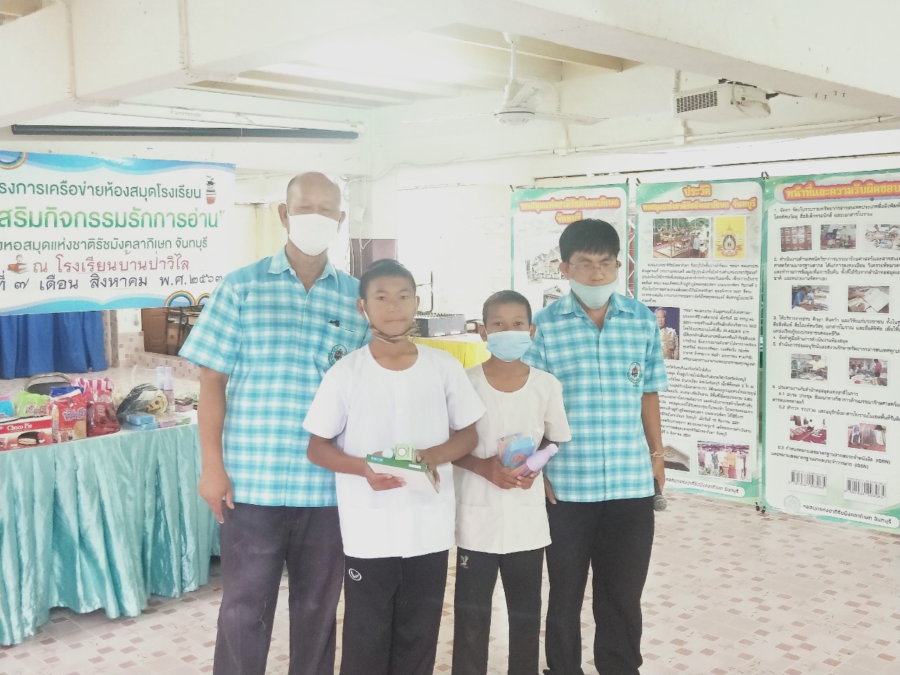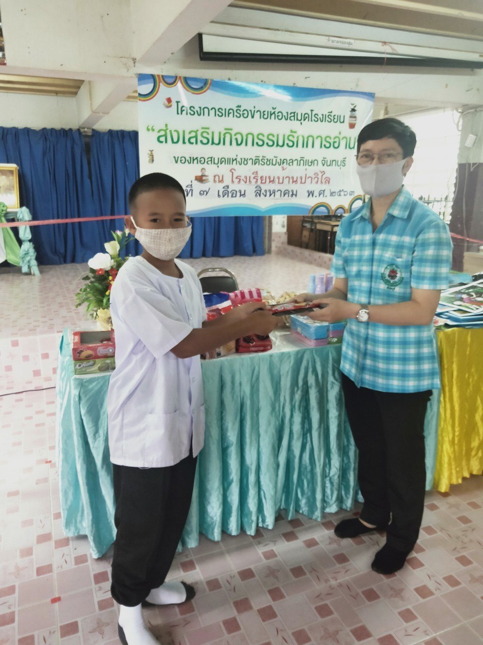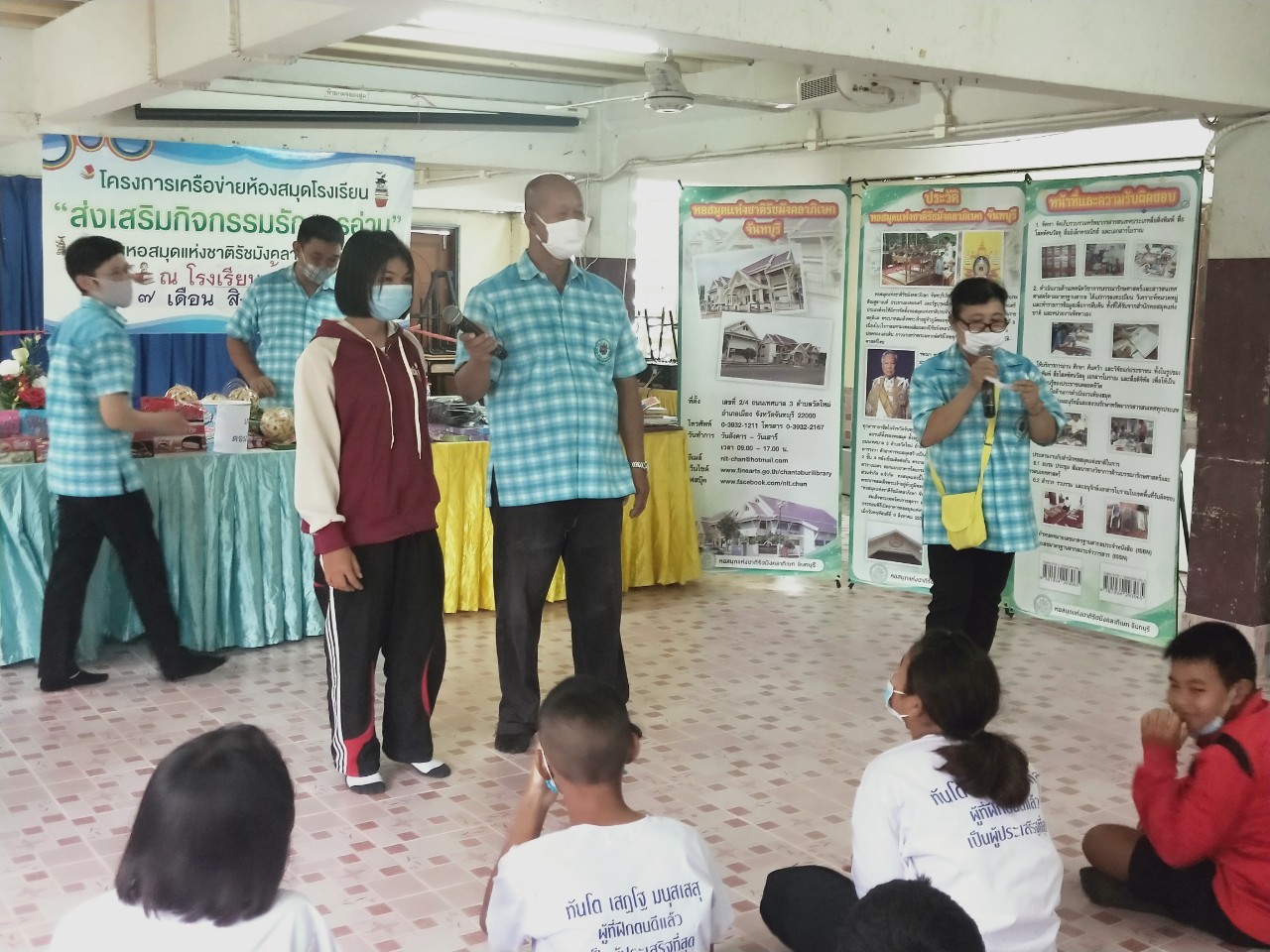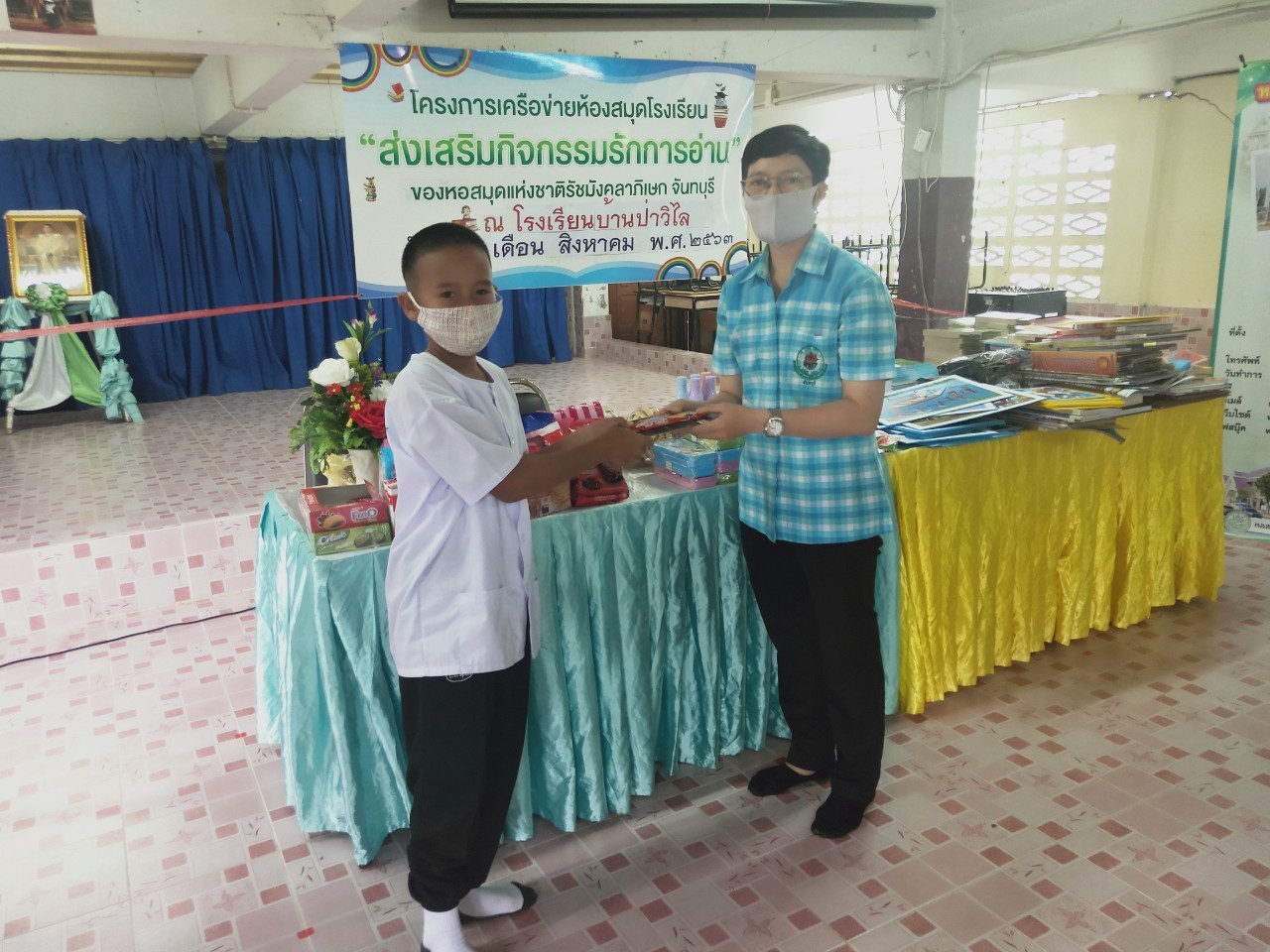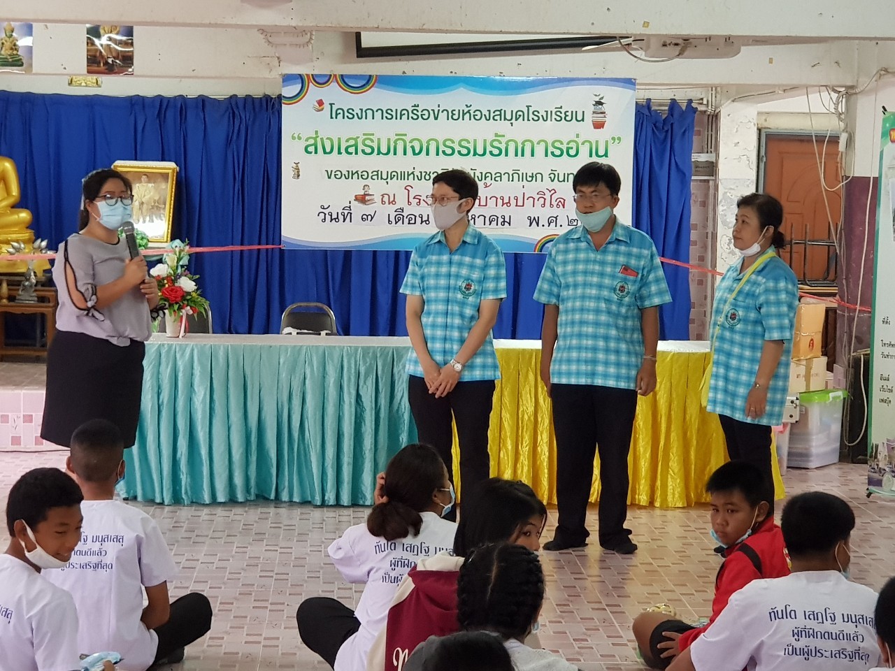 วันศุกร์ที่ 7 สิงหาคม 2563 นางสาวเมษา ครุปิติ บรรณารักษ์ชำนาญการ รักษาการในตำแหน่งผู้อำนวยการหอสมุดแห่งชาติฯ จันทบุรี พร้อมด้วย นายประพนธ์ ร...อบรู้ นักวิชาการโสตทัศนศึกษาชำนาญการ นางกรองแก้ว เปเหล่าดา บรรณารักษ์ชำนาญการ นายสุรศักดิ์ บัวเลียง เจ้าพนักงานห้องสมุดปฏิบัติงาน และนายมานะ กองกูต พนักงานขับรถยนต์ ออกไปจัดกิจกรรมส่งเสริมการอ่าน โครงการเครือข่ายห้องสมุดโรงเรียน ณ โรงเรียนบ้านป่าวิไล ต.คลองใหญ่ อ.โป่งน้ำร้อน จ.จันทบุรี โดยแนะนำให้รู้จักหอสมุด แนะนำสารนิเทศต่างๆ กิจกรรมถามตอบปัญหาอะไรเอ่ย ทายภาพสุภาษิต-คำพังเพย กิจกรรมนันทนาการ ( เตรียมความพร้อม "รหัสปรบมือ" ฝึกท่าทางประกอบการทำมือ เพลงปรบมือ" เพลง"แก้วกะลาขันโอ่ง" และเพลง "ส้มตำมะละกอส้มตำ" เต้นเพลง"ต๊กแก" ) และแข่่งขันเต้นเพลง "ปี้จนป่น" และเพลง "เลิกคุยทั้งอำเภอ" แจกหนังสือส่งเสริมการอ่านแทนการนำหนังสือไปให้อ่าน เพื่อหลีกเลียงการสัมผัสป้องกันโรคไวรัส โควิด-19 โดย ผู้อำนวยการโรงเรียน และคณะครู ให้การต้อนรับ มีนักเรียนชั้น ม.1 - 3 ร่วมกิจกรรม จำนวน 47 คน