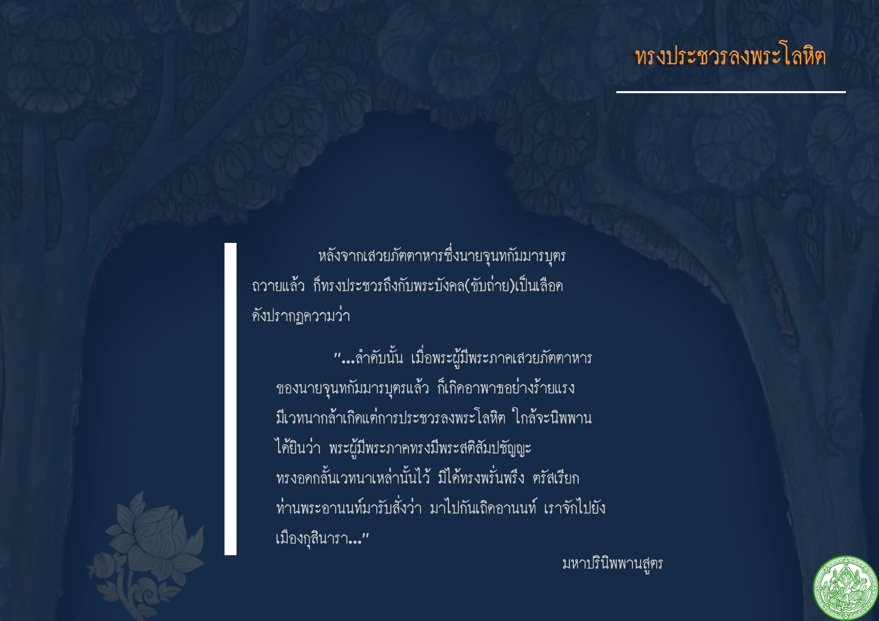 ก็เกิดอาพาธอย่างร้ายแรง มีเวทนากล้าเกิดแต่การประชวรลงพระโลหิต ใกล้จะนิพพาน ได้ยินว่า พระผู้มีพระภาคทรงมีพระสติสัมปชัญญะ ทรงอดกลั้นเวทนาเหล่านั้นไว้ มิได้ทรงพรั่นพรึง ตรัสเรียกท่านพระอานนท์มารับสั่งว่า มาไปกันเถิดอานนท์ เราจักไปยังเมืองกุสินารา...”