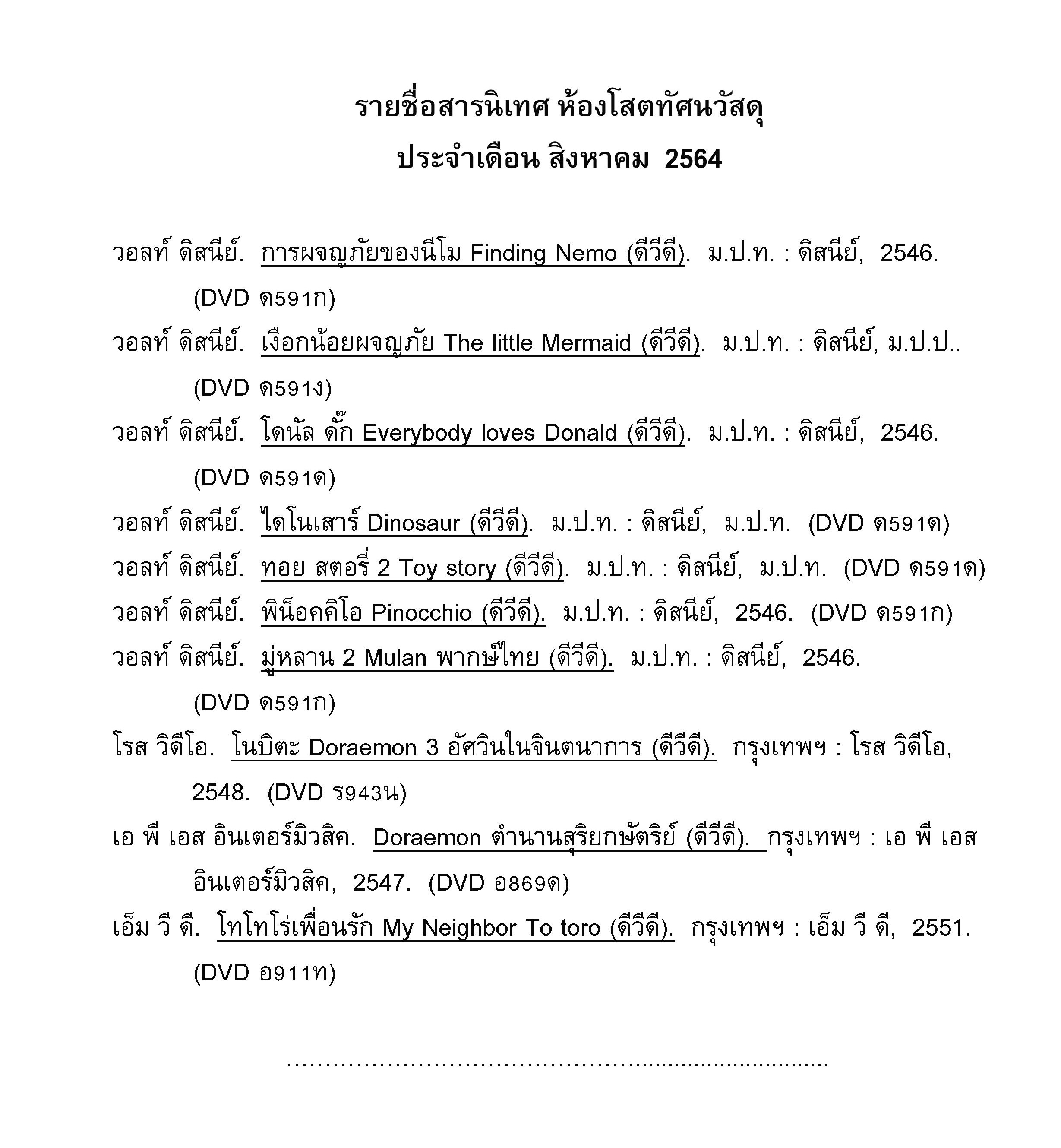 รายชื่อสารนิเทศโสตทัศนวัสดุ ประจำเดือน สิงหาคม 2564