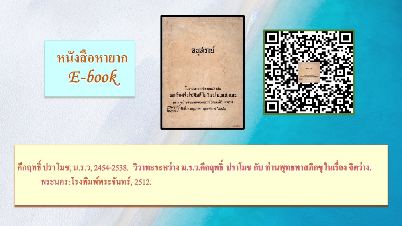 คึกฤทธิ์ ปราโมช, ม.ร.ว., 2454- 2538. วิวาทะระหว่าง ม.ร.ว. คึกฤทธิ์ ปราโมชกับท่านพุทธทาสภิกขุในเรื่อง จิตว่าง. พระนคร: โรงพิมพ์พระจันทร์, 2512.