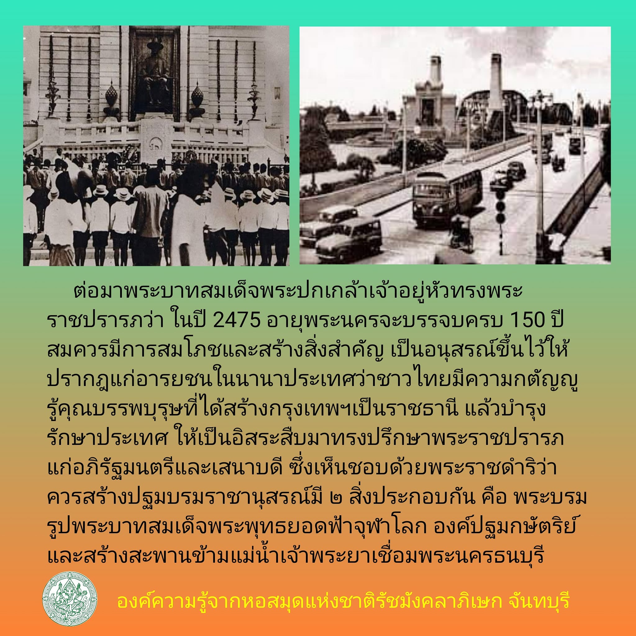 ต่อมาพระบาทสมเด็จพระปกเกล้าเจ้าอยู่หัวทรงพระราชปรารภว่า ในปี 2475 อายุพระนครจะบรรจบครบ 150 ปี สมควรมีการสมโภชและสร้างสิ่งสำคัญ เป็นอนุสรณ์ขึ้นไว้ให้ปรากฎแก่อารยชนในนานาประเทศว่าชาวไทยมีความกตัญญูรู้คุณบรรพบุรุษที่ได้สร้างกรุงเทพฯเป็นราชธานี แล้วบำรุงรักษาประเทศ ให้เป็นอิสระสืบมาทรงปรึกษาพระราชปรารภ แก่อภิรัฐมนตรีและเสนาบดี ซึ่งเห็นชอบด้วยพระราชดำริว่า ควรสร้างปฐมบรมราชานุสรณ์มี ๒ สิ่งประกอบกัน คือ พระบรมรูปพระบาทสมเด็จพระพุทธยอดฟ้าจุฬาโลก องค์ปฐมกษัตริย์ และสร้างสะพานข้ามแม่น้ำเจ้าพระยาเชื่อมพระนครธนบุรี