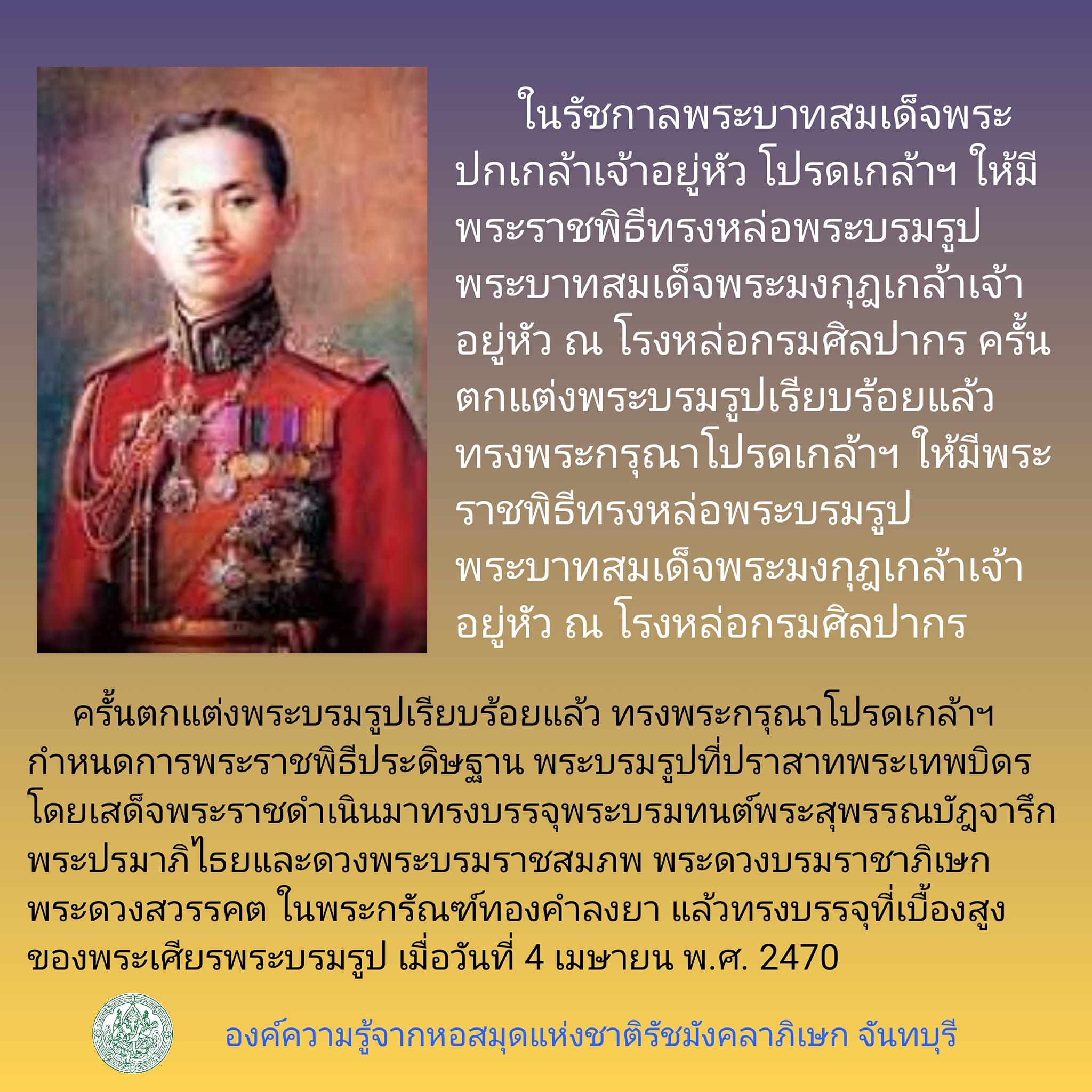 ในรัชกาลพระบาทสมเด็จพระปกเกล้าเจ้าอยู่หัว โปรดเกล้าฯ ให้มีพระราชพิธีทรงหล่อพระบรมรูปพระบาทสมเด็จพระมงกุฎเกล้าเจ้าอยู่หัว ณ โรงหล่อกรมศิลปากร ครั้นตกแต่งพระบรมรูปเรียบร้อยแล้ว ทรงพระกรุณาโปรดเกล้าฯ ให้มีพระราชพิธีทรงหล่อพระบรมรูปพระบาทสมเด็จพระมงกุฎเกล้าเจ้าอยู่หัว ณ โรงหล่อกรมศิลปากร
